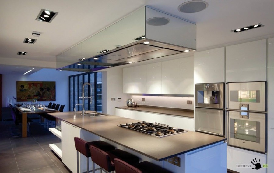 Отличный способ подсветки рабочих поверхностей кухонного острова – встраивание светильников в нижнюю часть вытяжки. В результате ваш высокотехнологичный прибор не только избавляет просторное помещение от запахов приготовления пищи, но и служит конструкцией для расположения системы регулируемой подсветки.