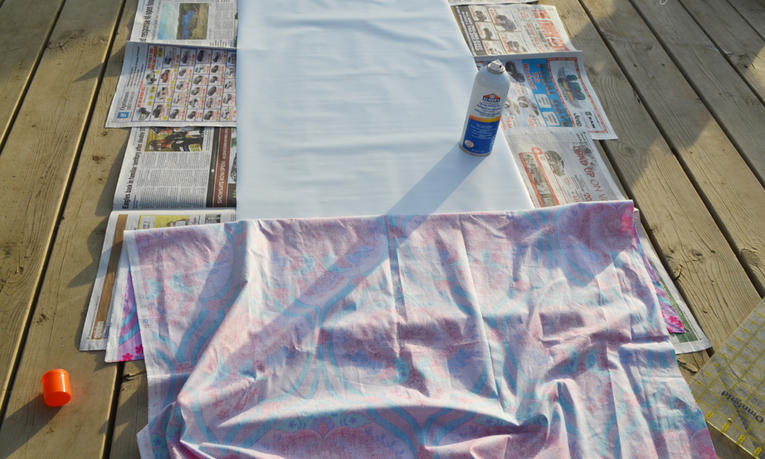 Самая сложная задача – максимально ровно приклеить ткань к полотну. Для этого отгибаем ее с нижнего края и наносим плотным слоем клей. Сразу же прикладываем ткань обратно и разглаживаем ее. Повторяем то же самое до тех пор, пока детали не будут соединены между собой полностью.