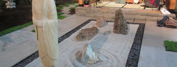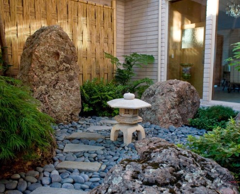 Даже один необработанный камень можно использовать как полунамек на полноценный сад камней для оформления экстерьера в японском стиле: