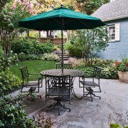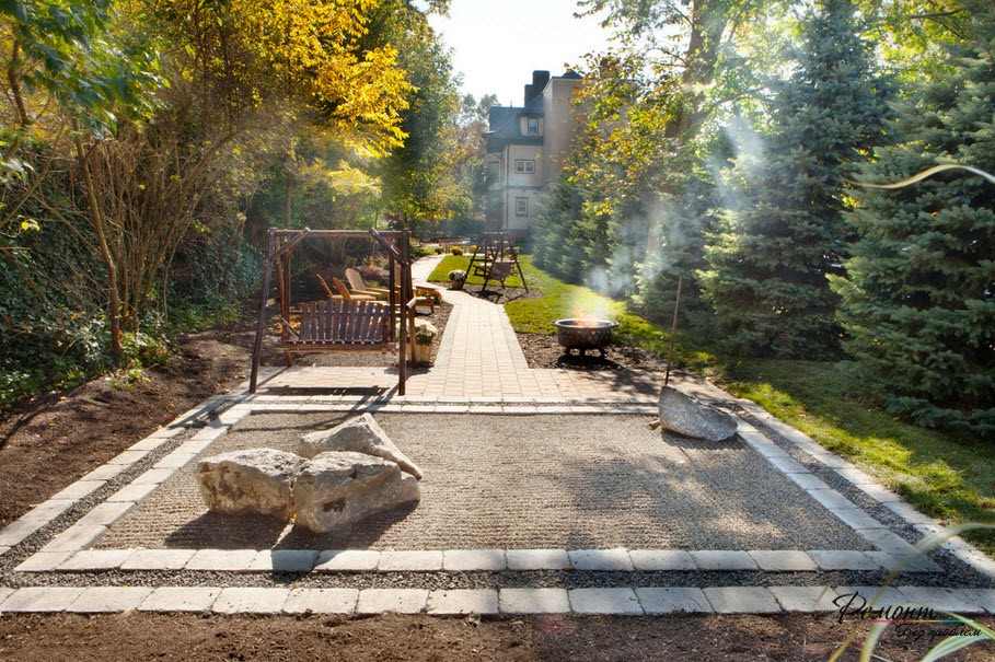Участок, в основе оформления которого использованы зеленые насаждения, можно дополнить оригинальными конструкциями из камня или выложить галькой часть участка, оформив волнообразный край, напоминающий берег реки:
