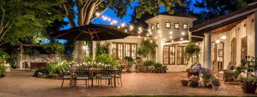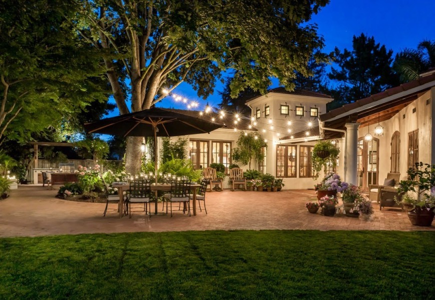 - создать праздничное освещение в саду можно с помощью гирлянд и светодиодных полос, размещенных на деревьях, в беседке или по периметру патио.