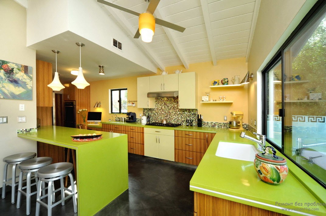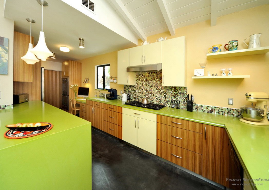 Излишество салатового цвета, по мнению специалистов-дизайнеров, может несколько нарушить гармонию цветов. Но, если вам нравится доминирование этого цвета, что ж, это дело вкуса. Полет фантазии не возбраняется, особенно, если это эко-стиль. Главное, чтобы кухня не выглядела однообразной.