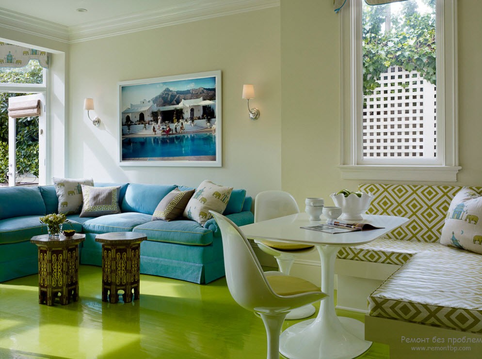 Мягкая мебель цвета морской волны или подобных оттенков будет прекрасно сочетаться со стенами и диванными подушечками салатового цвета. Хорошим дополнением будет оранжевый цвет какого-нибудь предмета или аксессуара