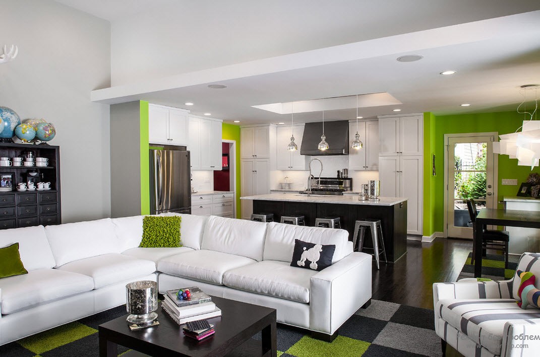 Отлично будет смотреться гостиная комната, в которой салатовый цвет не доминирует в какой-то одной ее части, а как бы растворен в остальных элементах интерьера. Он может одновременно присутствовать и в окрасе стен, и в напольном покрытии, и в диванных подушечках и т.п. Простора для вашей фантазии предостаточно.