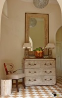 Легкое прикосновение бирюзово-голубой палитры присутствует и в настенном декоре, в оформлении невысокого прикроватного столика и даже в ковровом покрытии. Привлекательной изюминкой интерьера спальни стал ансамбль из дополнительных предметов меблировки – резное место для сидения и рама для зеркала, выполненные в одной манере декора, смотрятся эффектно, привлекают внимание и являются украшением дизайна помещения.