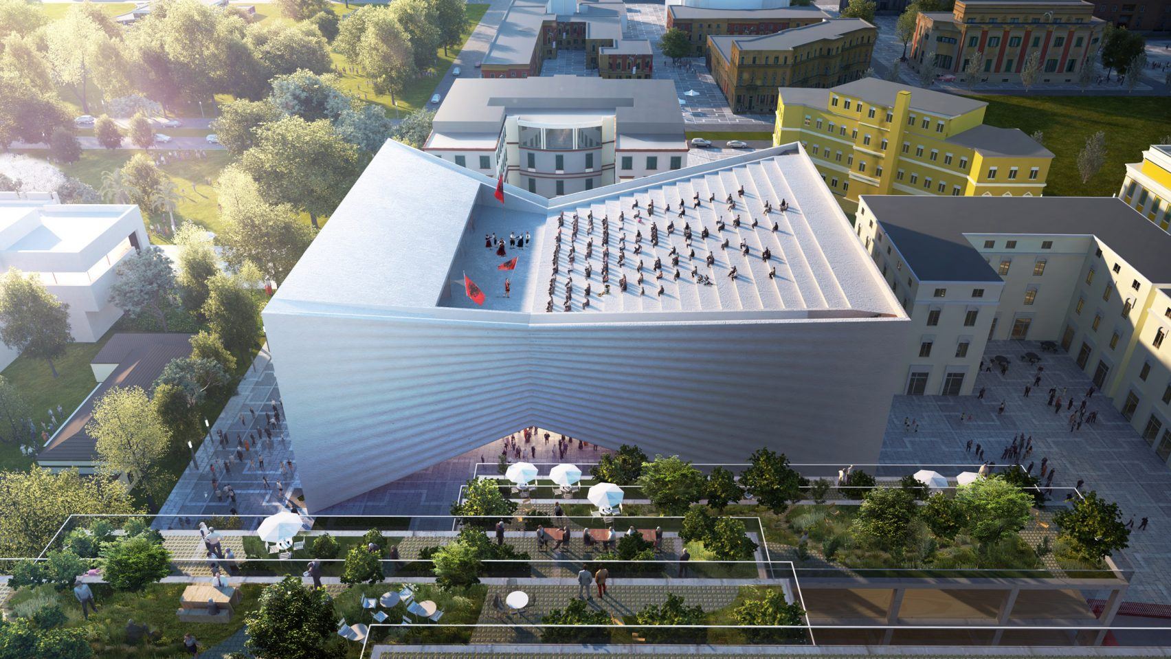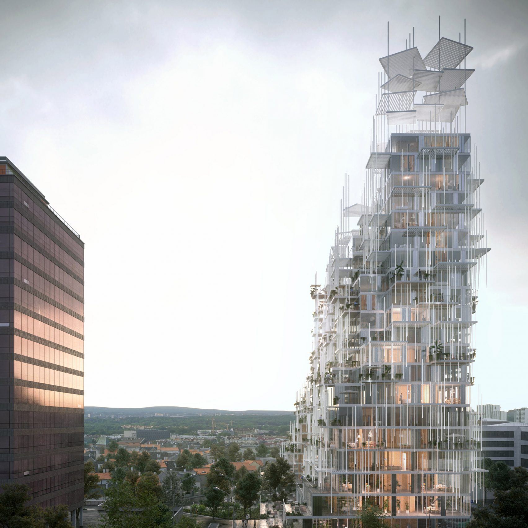 Зеркальные фасады двух зданий эффектно сливаются с пейзажем вокруг. Идея дизайна итальянского архитектора Петера Пихлера – сдвинуть блоки для придания динамики, остеклить фасады зеркальными панелями, декорировать торцы окнами в виде клиньев, а все здание приподнять на платформу, чтобы создать ощущение легкости.