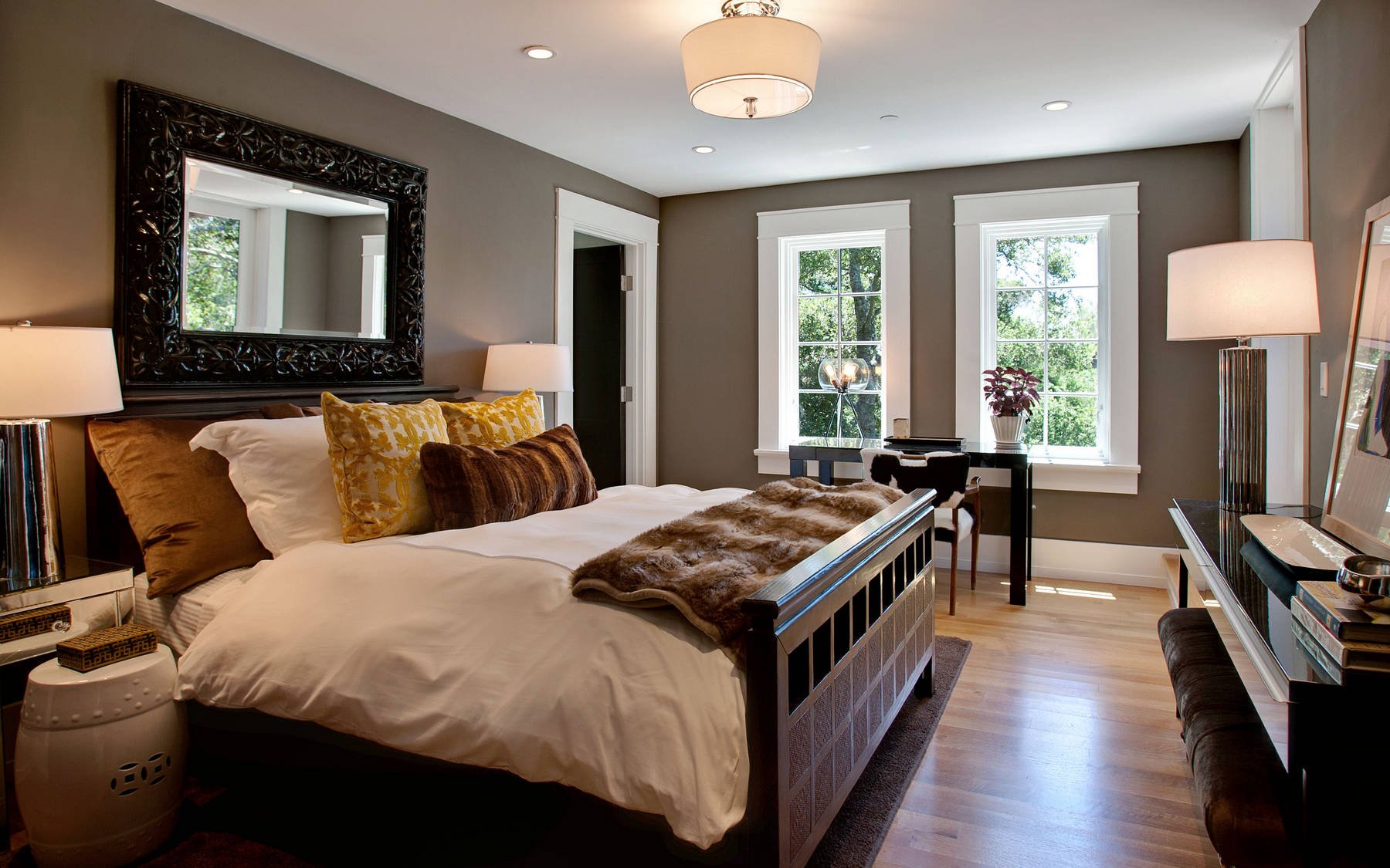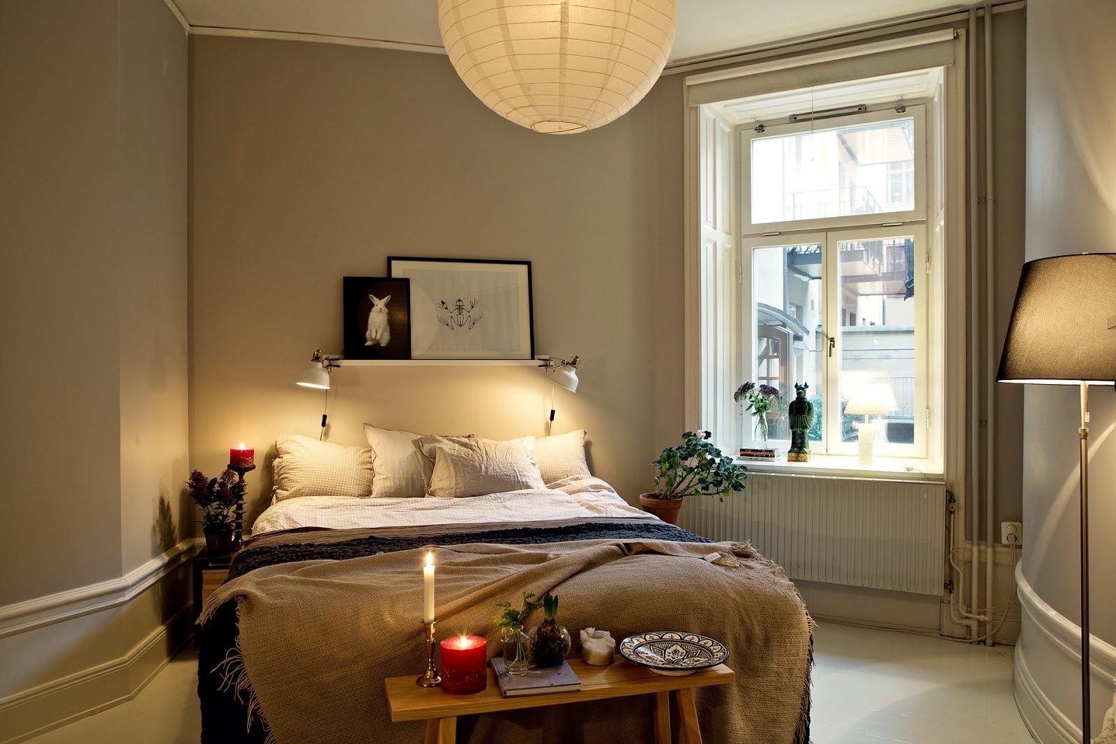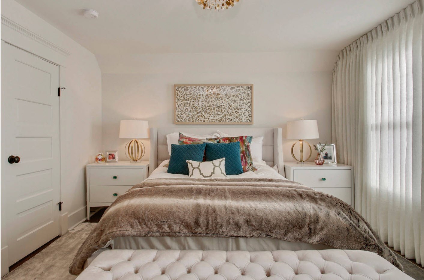 Для симметрии – одинаковые по размеру тумбы у кровати, пол из светлого паркета или линолеума также светлого тона. У кровати можно разместить ворсистый большой ковер, в котором будут утопать ноги, и который будет защищать от холода в промозглые вечера осени и зимы. Отличный дополнением в декоре станут живые растения в крупных горшках и кашпо, а также крупные напольные вазы, уютные абажуры на торшере или настольной лампе – все это простые, классические дополнения классического интерьера, которые как раз и дарят тот самый домашний уют и чувство защищенности и расслабления.