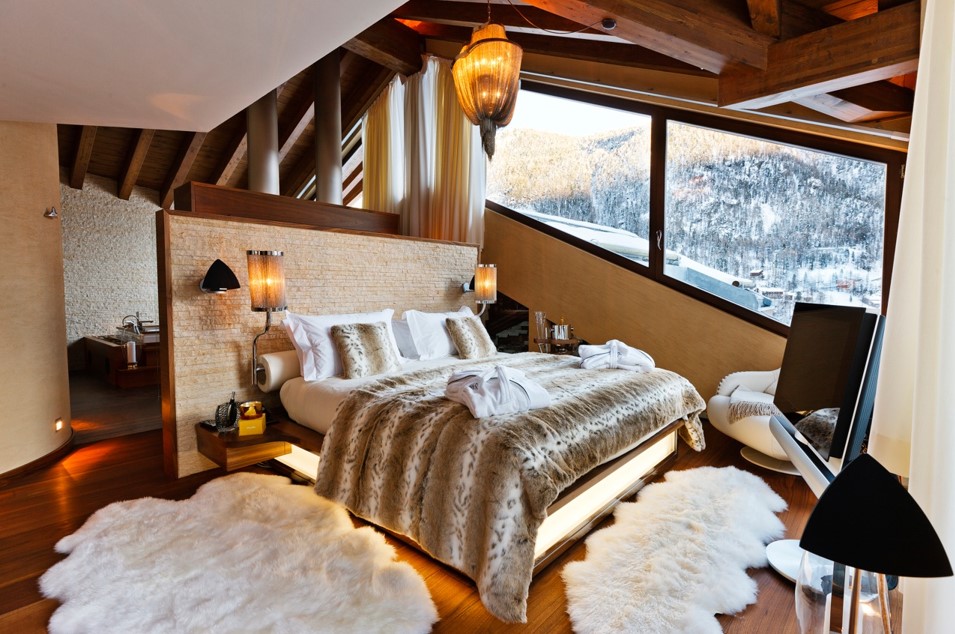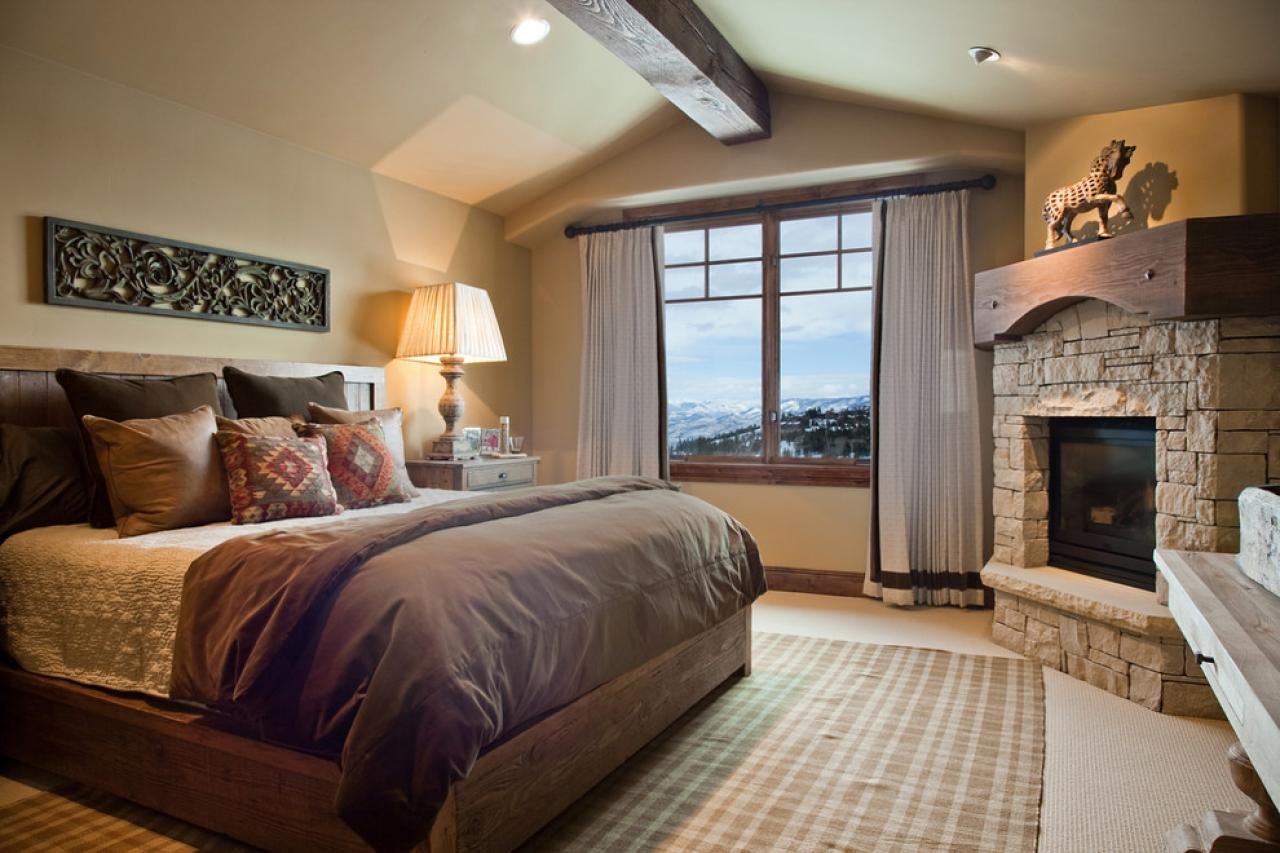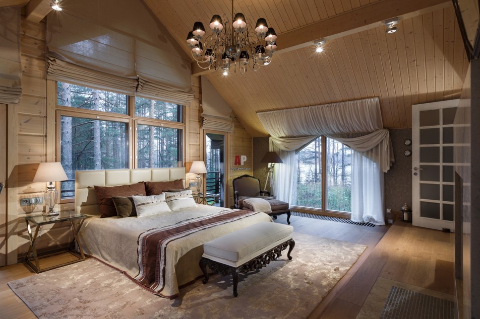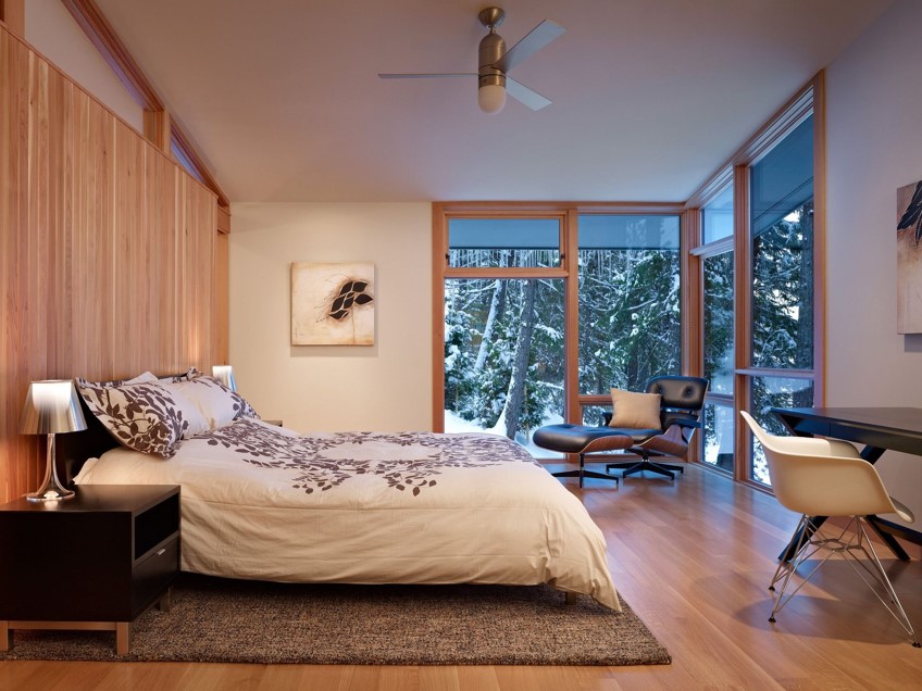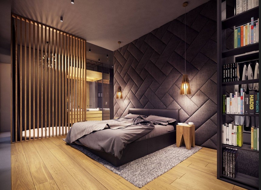 В дизайне используются теплые деревянные панели, которые монтируются не только на стены, но и на потолок и пол. Большая кровать из натуральных материалов укрывается мягким текстилем в приглушенной сдержанной цветовой гамме, и на пол можно положить темный красивый ворсистый ковер.
