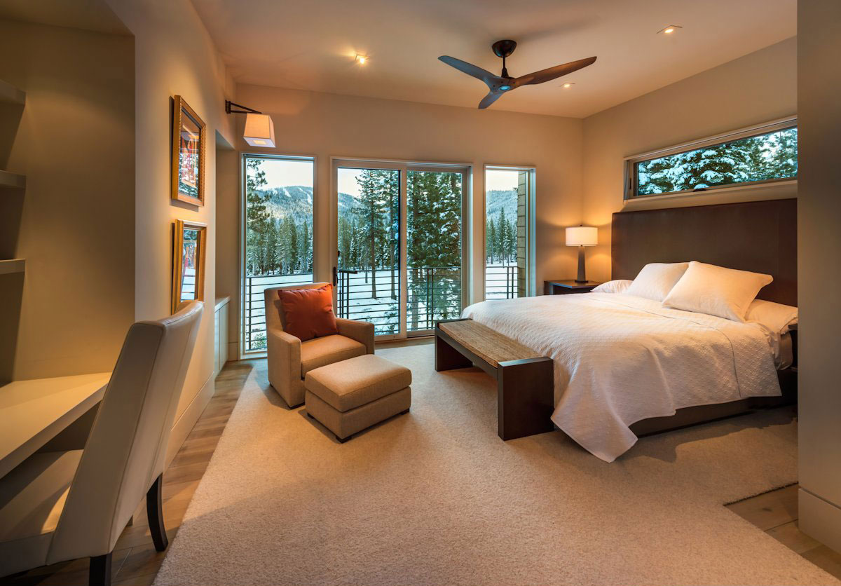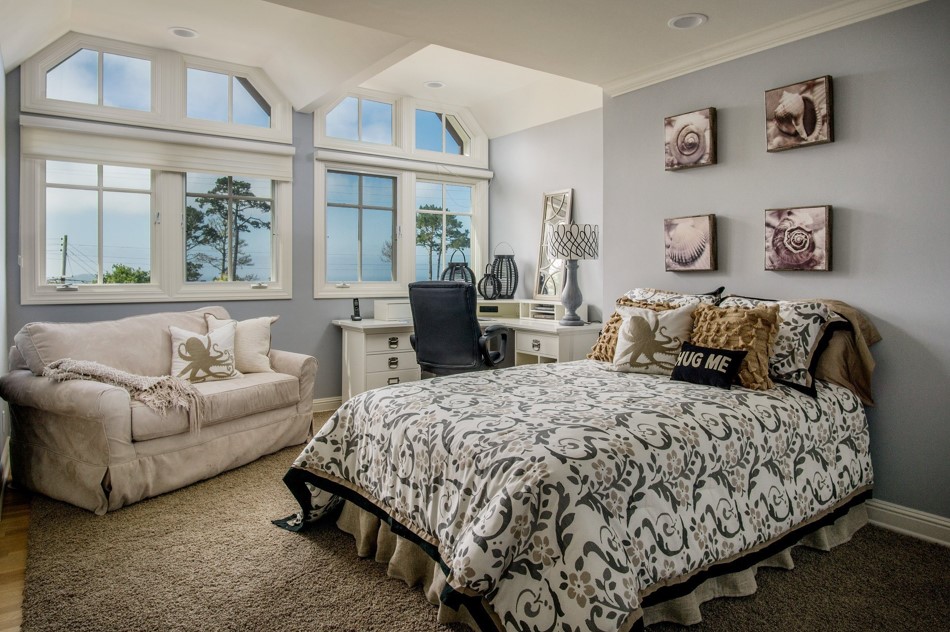 Интерьер такой необыкновенной спальни хорош как для частного дома, так и для квартиры. Большое в полный рост окно – панорамное, обеспечит доступ естественного освещения с улицы и потрясающий вид на город или природу, в зависимости от расположения квартиры или дома.