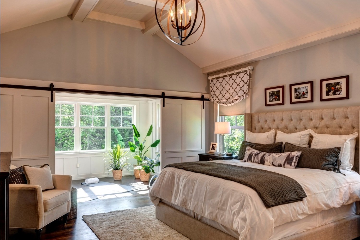 Просторная уютная дизайнерская спальня с панорамным окном
