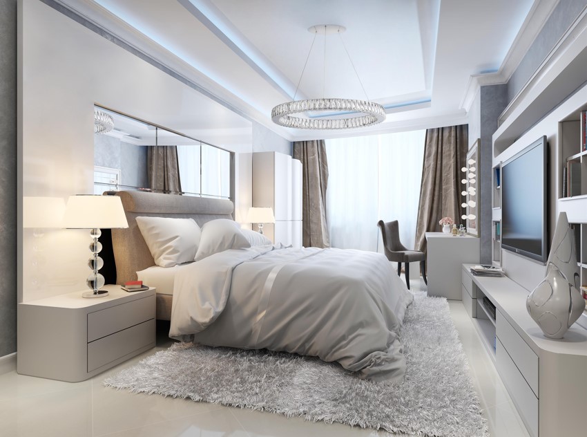 С обеих сторон кровати устанавливаются аккуратные небольшие прикроватные тумбочки, а сразу напротив помещается большой и вместительный платяной шкаф. Если есть место, можно поставить трюмо с мягким пуфом – туалетный столик для макияжа, с зеркалом и красивой подсветкой. Если места в комнате не хватает, туалетный столик с пуфом можно перенести на балкон и оформить его отдельной зоной – продолжением спальни.