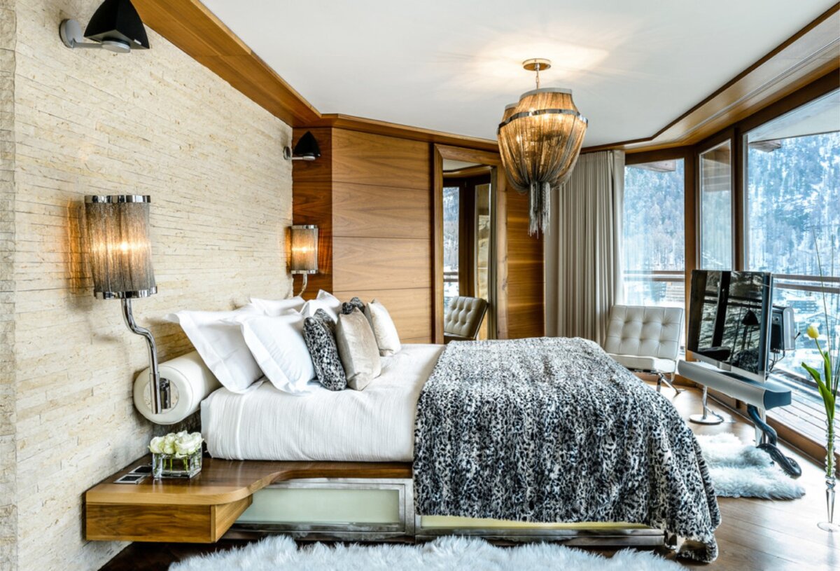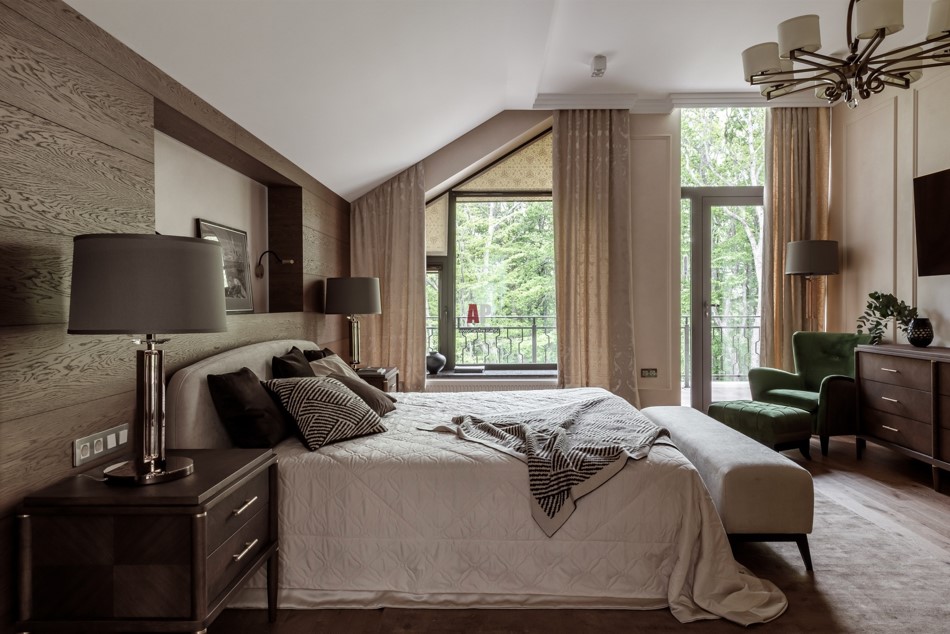 - Просторная уютная дизайнерская спальня с панорамным окном