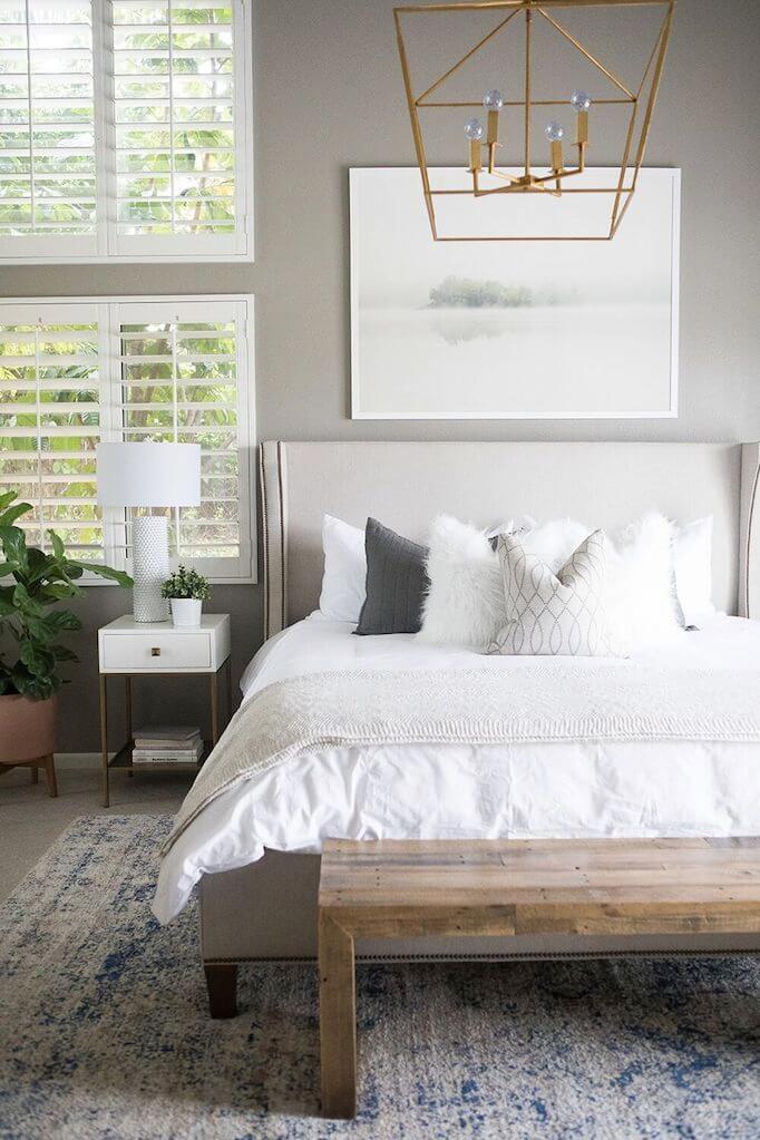 Белая мебель универсальна и помогает подчеркнуть внутреннюю отделку. Обратите внимание на дополнения: подушки, картины, ночные лампы или цветочные горшки на подоконнике. Для серой спальни характерен скандинавский стиль, в котором главенствует белый или мебель из натурального дерева, а также ковки.
