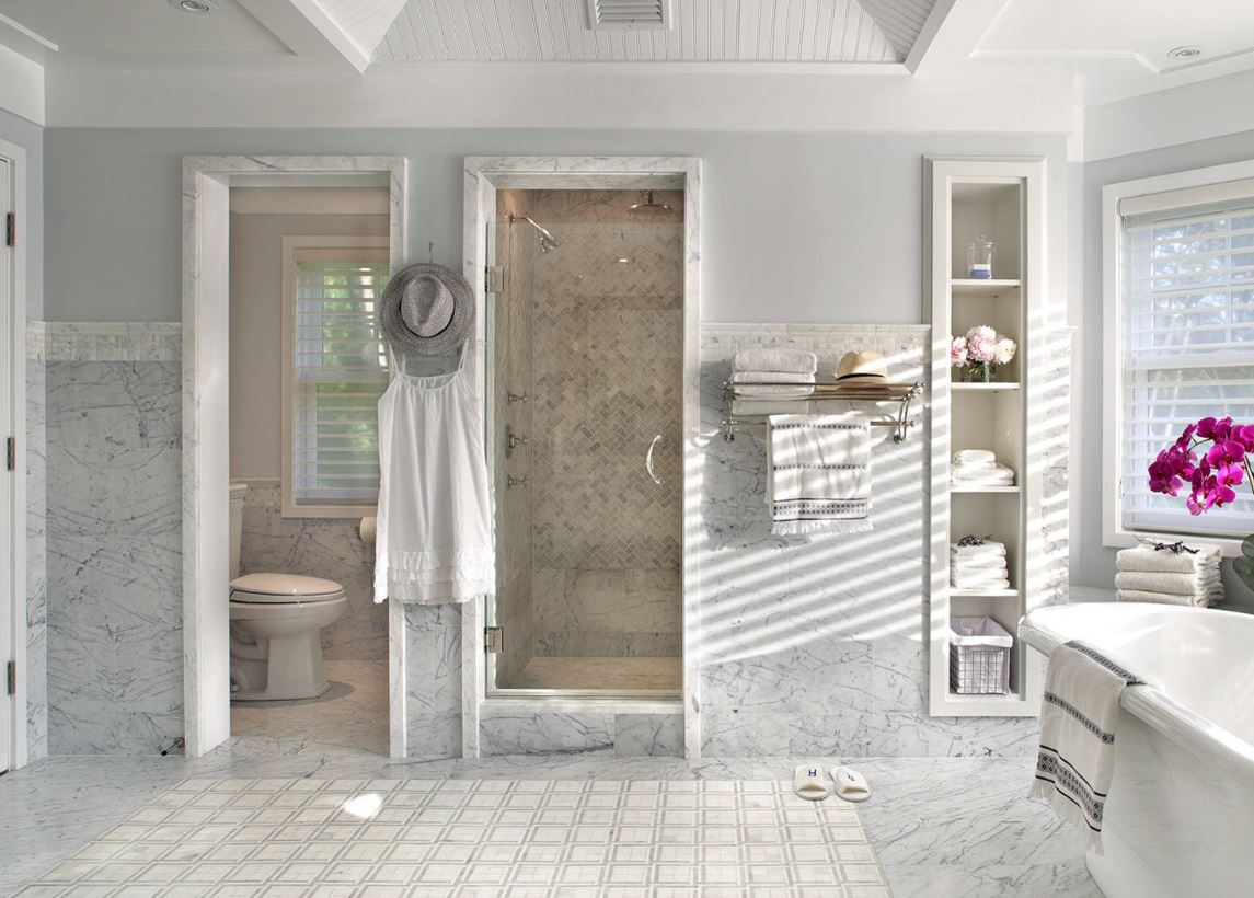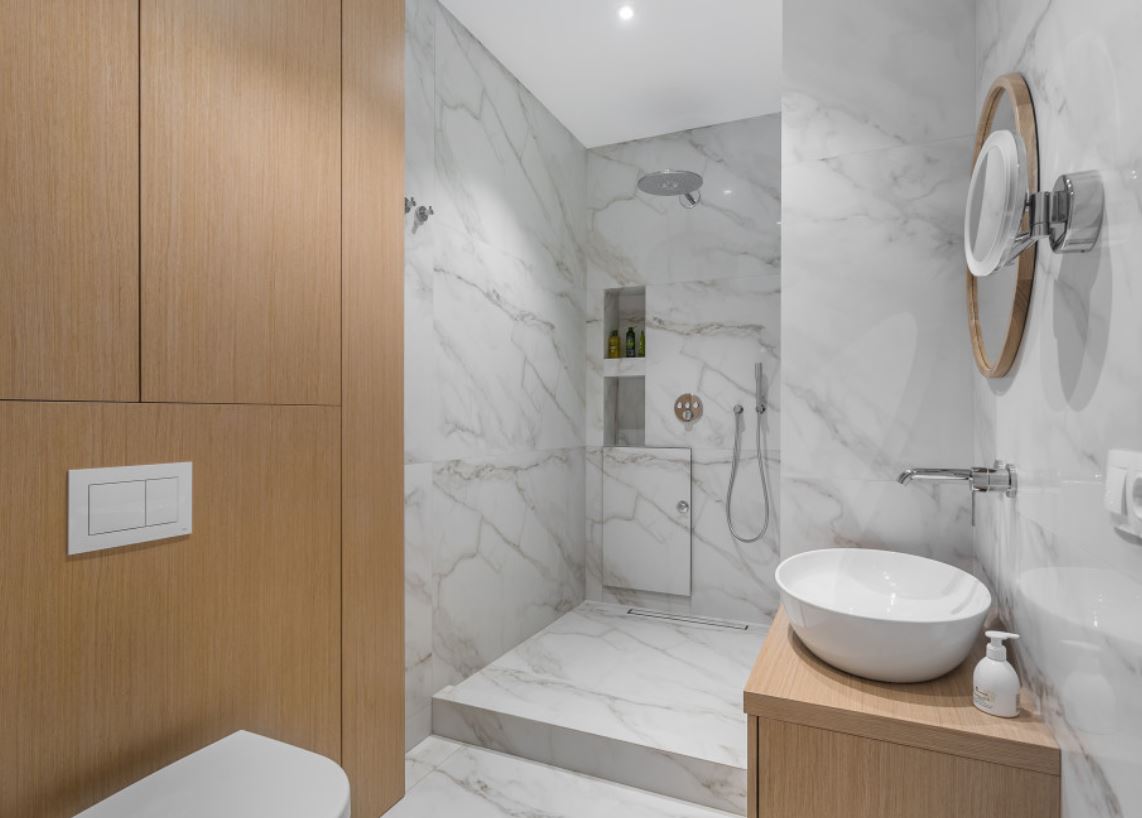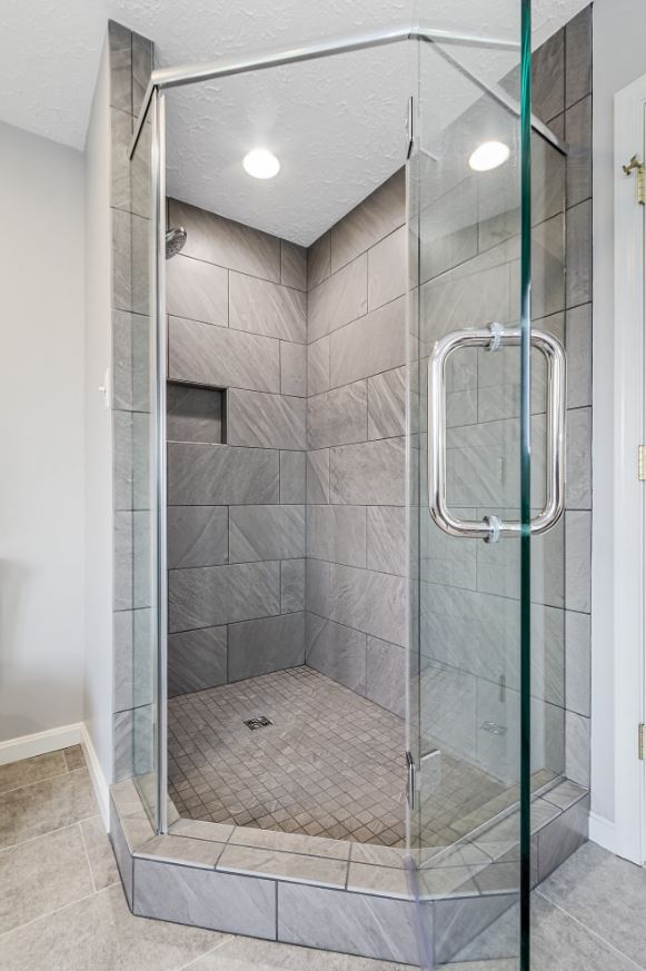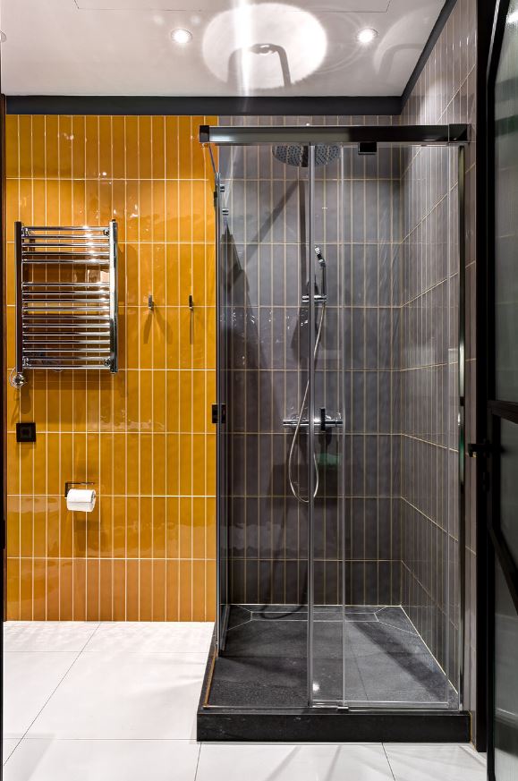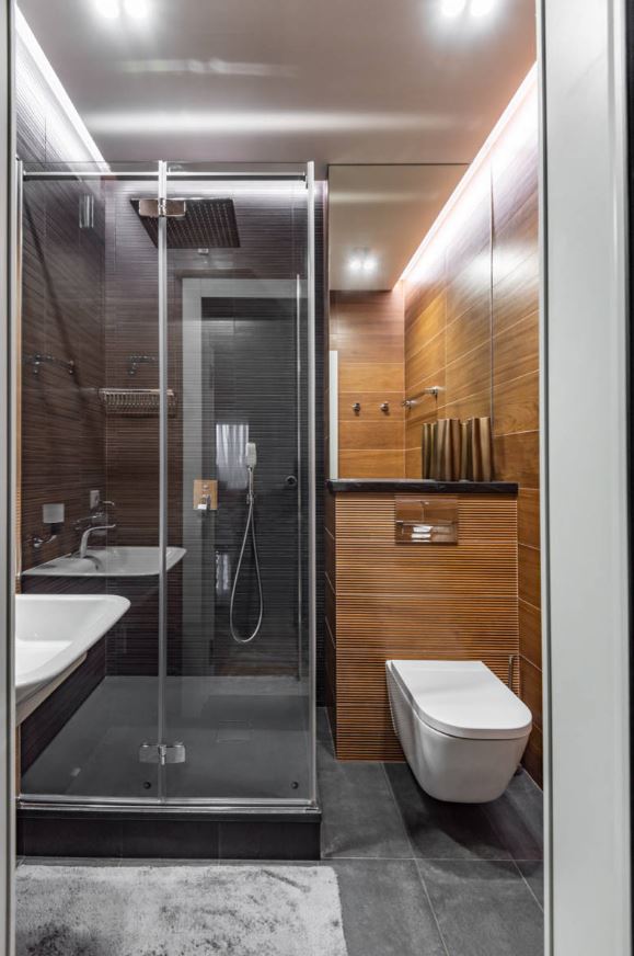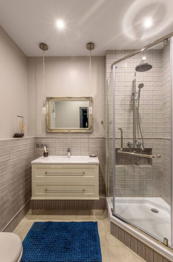 Хотите сэкономить место комнате? Выбирайте серую ванную с душем без поддона.