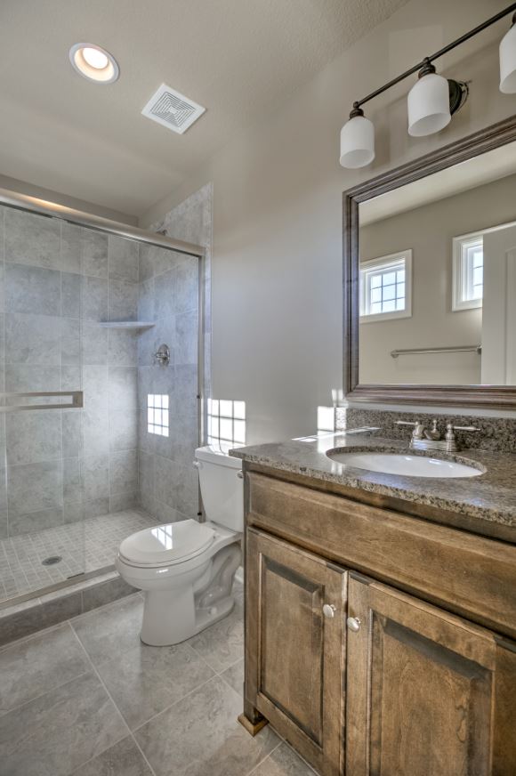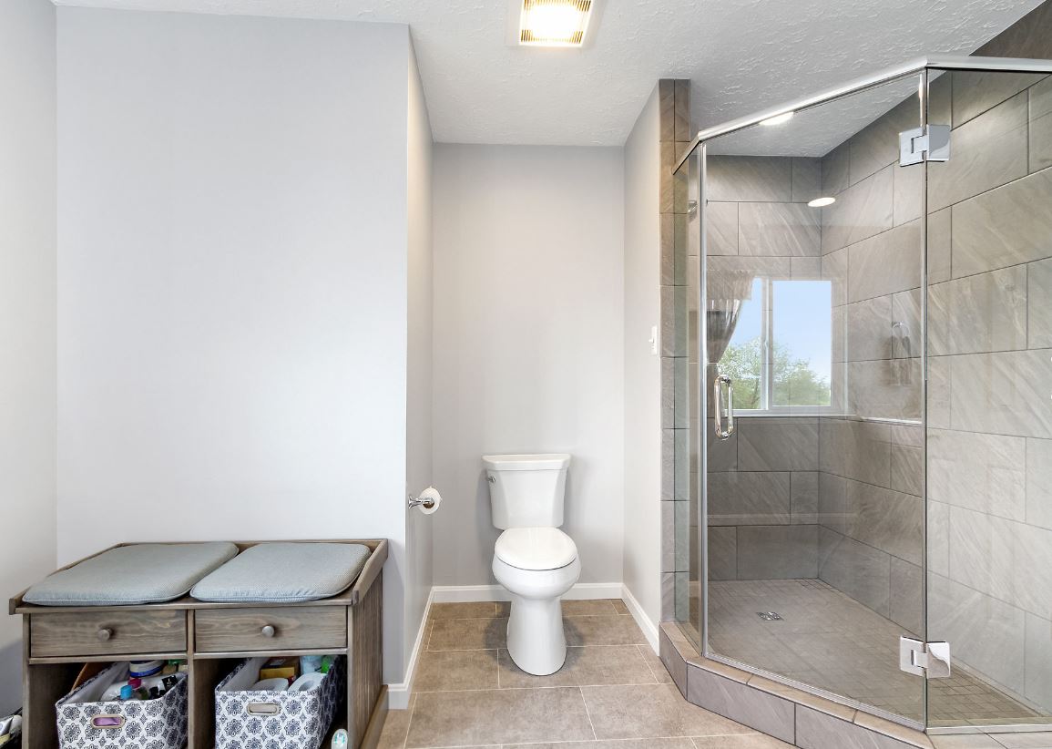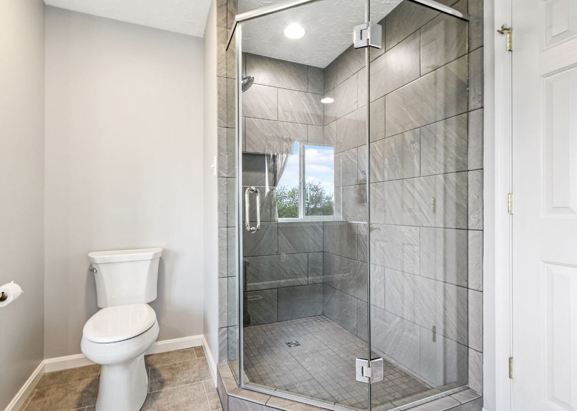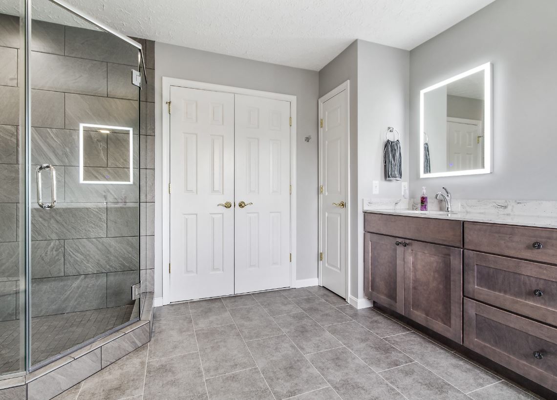 Хотите сэкономить место комнате? Выбирайте серую ванную с душем без поддона.