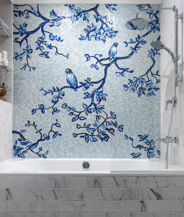 Серый цвет в ванной легко сочетается с любым рисунком и узором.
