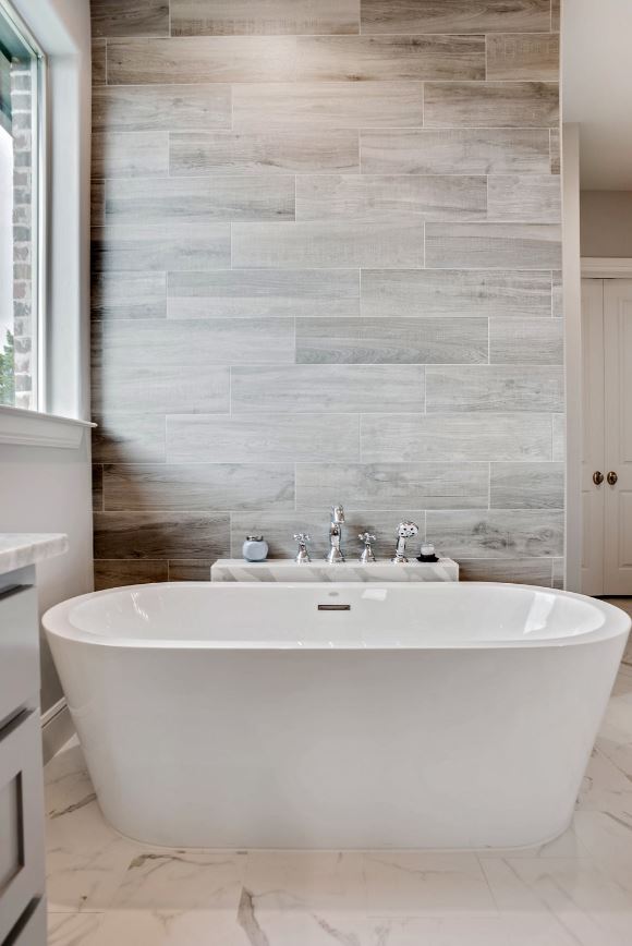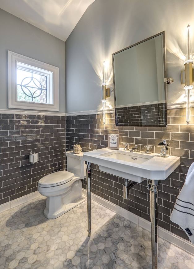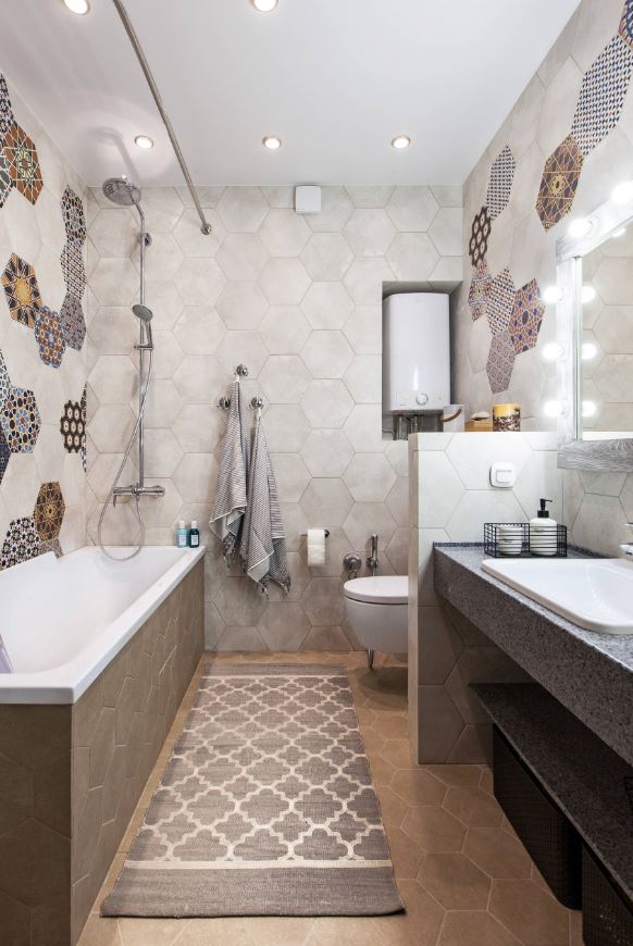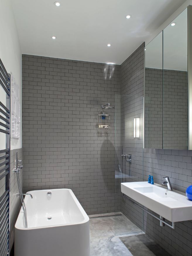 Хотите визуально добиться эффекта удлинения комнаты? Выбирайте прямоугольную серую плитку, расположив ее горизонтально.