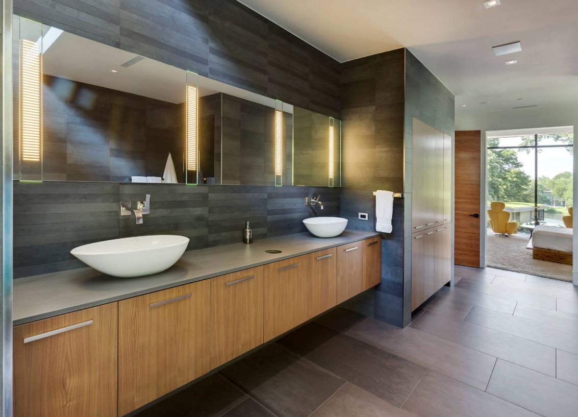 - Серая ванная с деревом