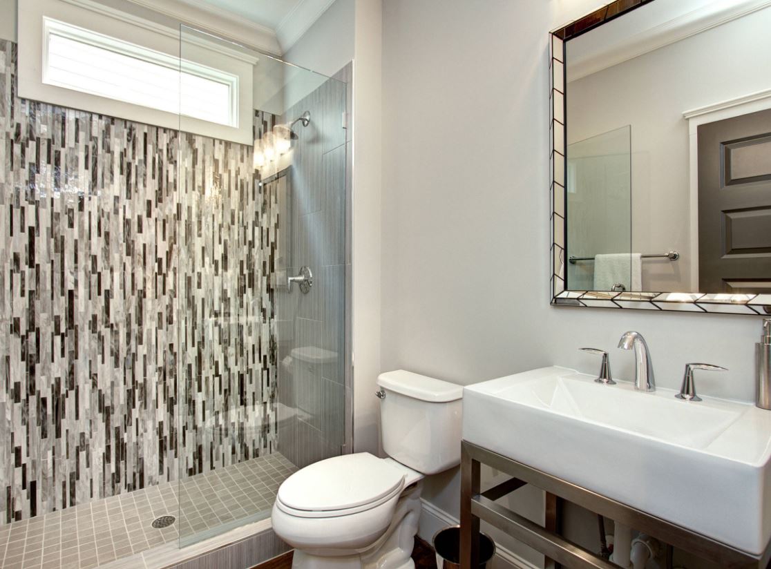 Для больших ванных комнат хорошо подойдет оттенок серого стекла, для маленьких комнат стоит выбирать нежные оттенки серого.
