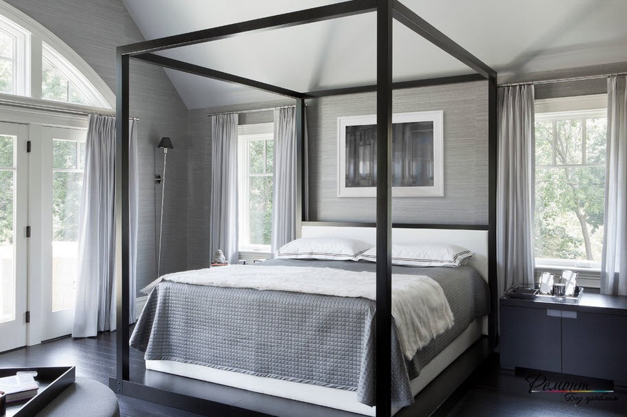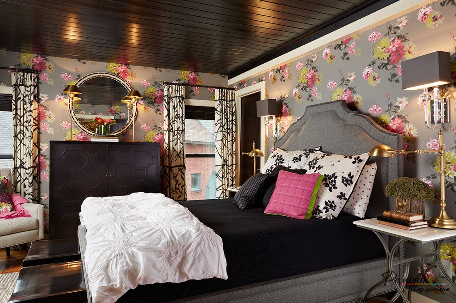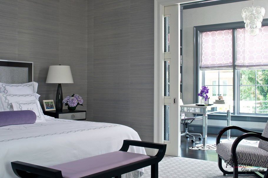 Цвет штор обычно подбирается более темного оттенка относительно отделки стен. Особенно это касается спален, где необходимо главный акцент сделать на кровати, представляющей центральный элемент всего интерьера. Для того, чтобы обстановка получилась более мягкой и нежной, очень хорошо сочетать серый цвет с розовым.
