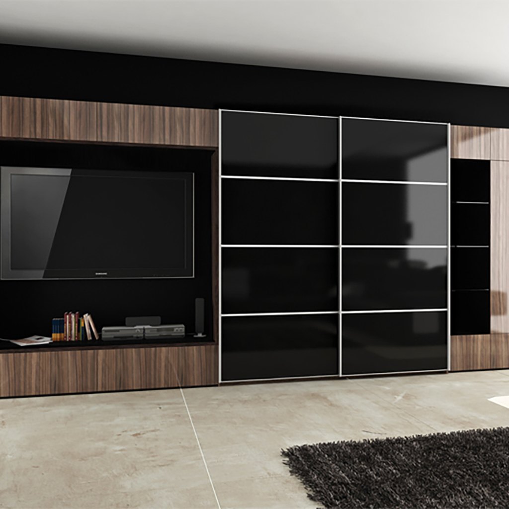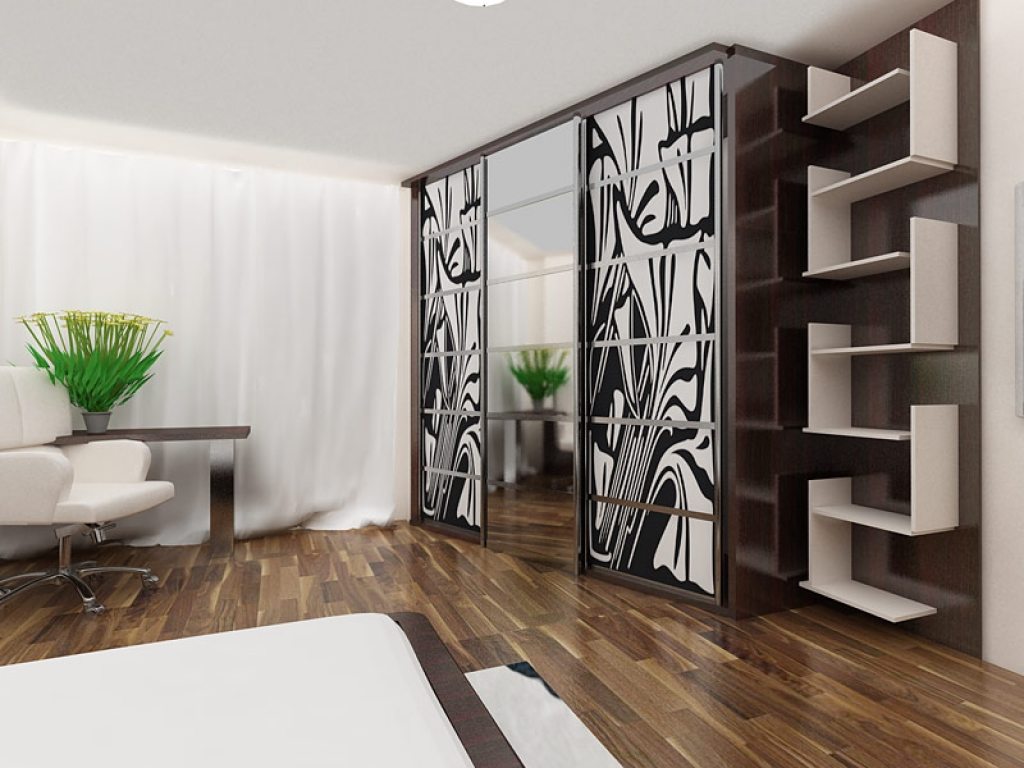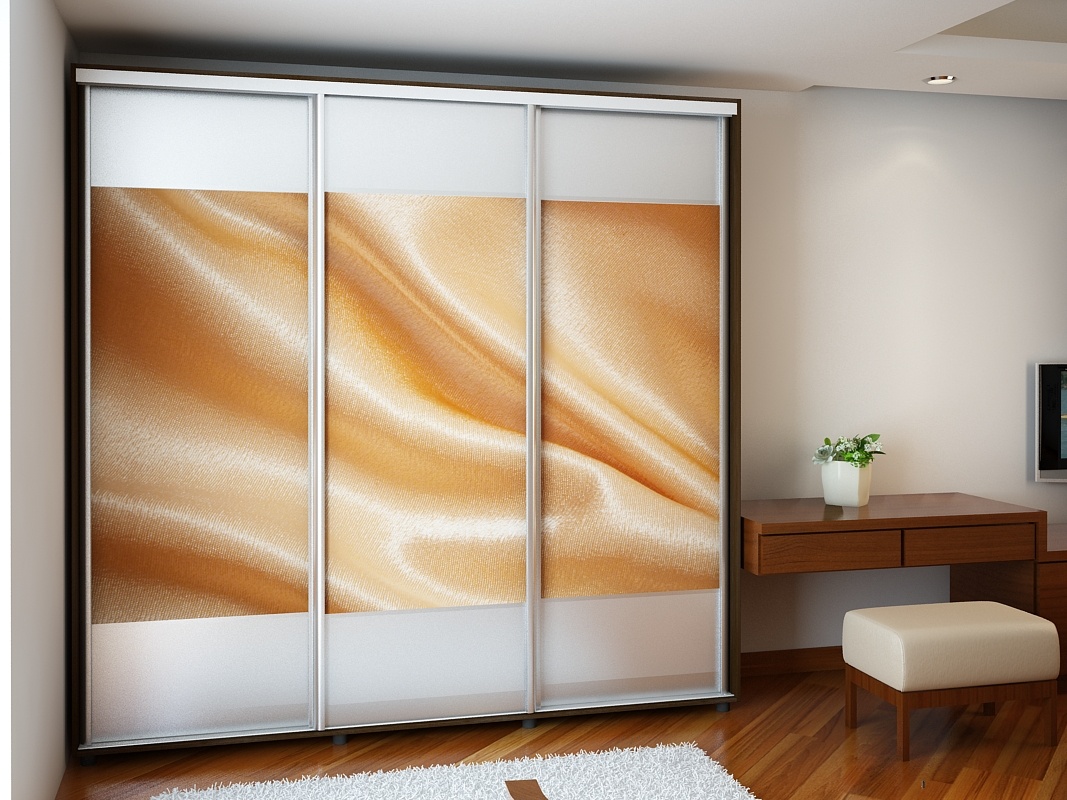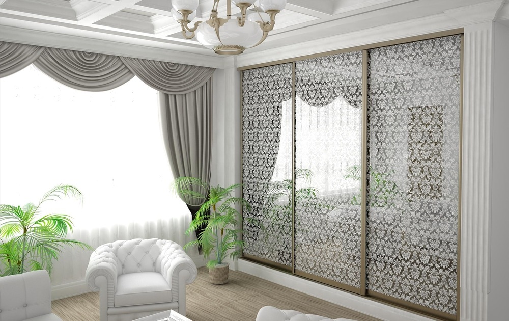 Что касается изготовления дверей шкафа, то их оформление обязательно должно соответствовать общей стилистике гостиной. Наиболее частым выбором покупателей является матированное или цветное стекло. На нем при желании можно выполнить различные узоры, а также сделать фотопечать. Однако данное решение постепенно сдает свои позиции. Более актуальными и в то же время дорогостоящими считаются двери из витражного стекла. Не менее популярным все еще является зеркальный шкаф. Это идеальное решение для гостиной небольшого размера. Поскольку с его помощью можно визуально расширить пространство.