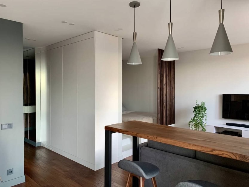 Интересно, что корпусный шкаф часто выбирают, как интерьерное решение для зонирования пространства. Особенно часто его используют в гостиной студии. Разнообразие материалов и декоративных деталей позволяет сделать шкаф стильным, актуальным для выбранного интерьера. Но учитывайте, что данное решение точно не подойдет для слишком маленькой комнаты.