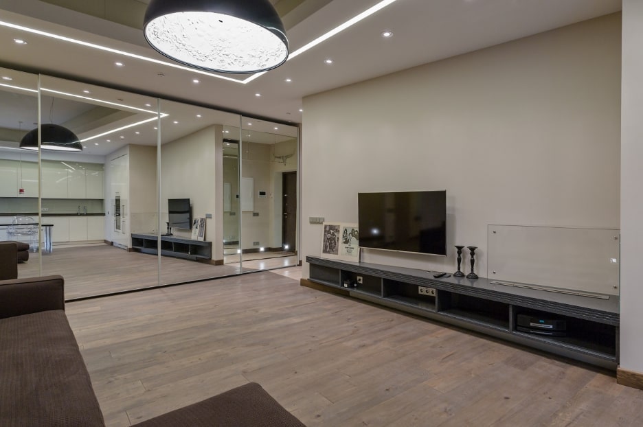 Гостиная по праву считается главной комнатой во всем доме. Здесь хозяева принимают гостей, да и сами проводят немало времени в кругу семьи. И очень важно, чтобы в эти моменты ничто постороннее не отвлекало. Дизайнеры часто предлагают в гостиной установить шкаф-купе, в котором можно хранить все вещи, создающие визуальный шум. К примеру, сезонный декор, книги, альбомы, диски и многое другое.