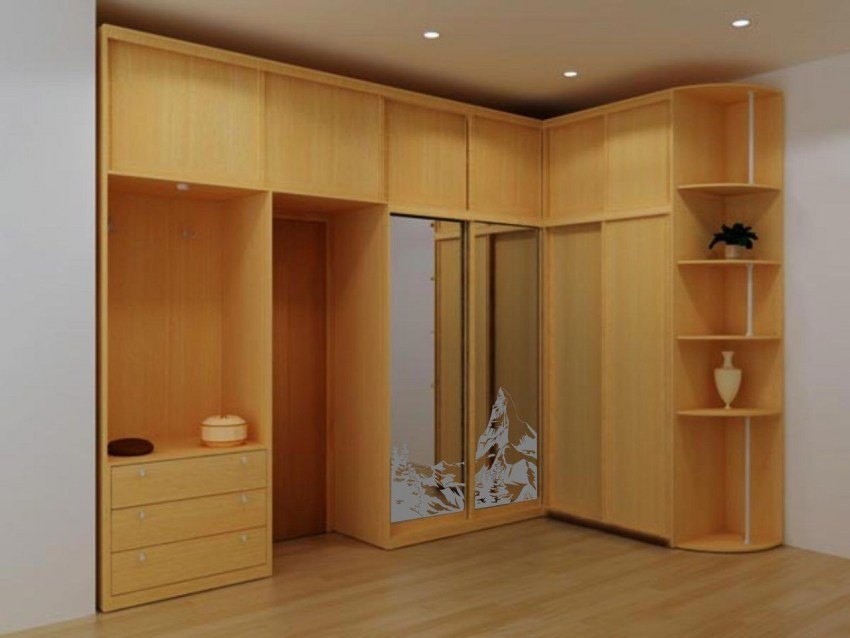 Шкаф угловой конструкции отличается эргономичностью и стильным внешним видом. Для его изготовления используют следующие материалы: ДСП (древесно-стружечная плита), ДВП (древесноволокнистая плита), МДФ (мелкодисперсная фракция), более дорогостоящий вариант – натуральная древесина.
