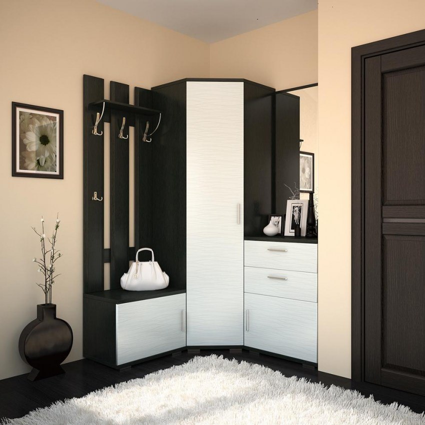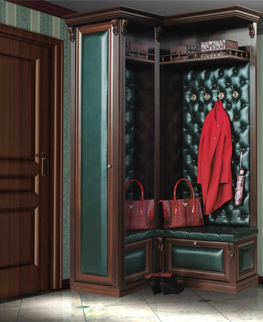 Угловые шкафы представлены в основных видах: глубокий радиусный, не менее вместительный прямоугольный, соединяющий смежные стены треугольный, трапециевидный с торцевыми выступающими боковыми стенками. Угловые шкафы, имея соответствующий декор, гармонично вписываются в популярные стили интерьера прихожей: нестареющую классику, деревенский прованс, функциональный и лаконичный минимализм, оригинальный модерн, модный лофт.