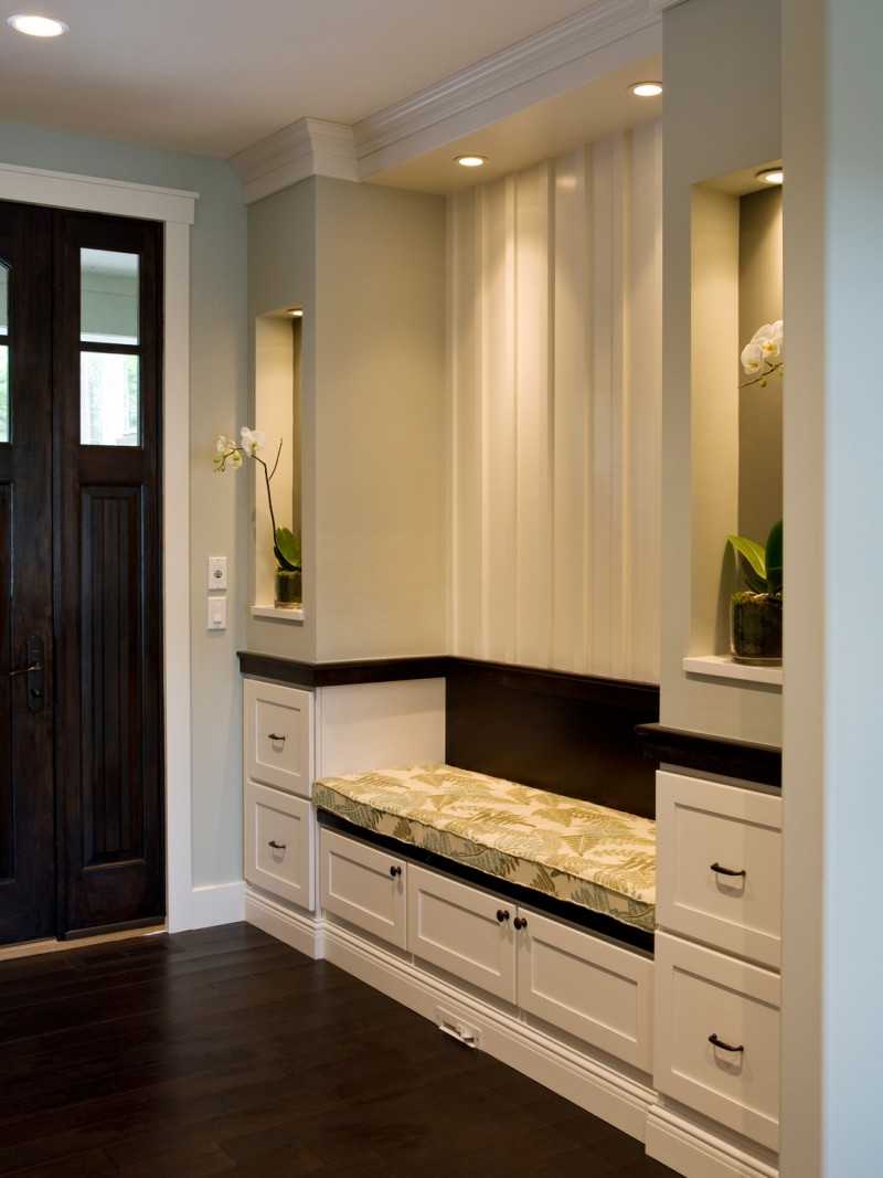 Также встроенный шкаф можно расположить на целой стене вокруг входной или межкомнатной двери, а также между дверцами шкафа можно обустроить открытую нишу для скамейки, вешалки или обувницы. Для просторной прихожей подойдет радиусный встроенный шкаф, больше похожий на небольшую удобную и многофункциональную комнату, которая закрывается при помощи раздвижных дверок с оригинальным и стильным дизайном дверных фасадов.