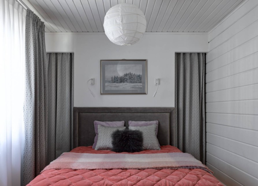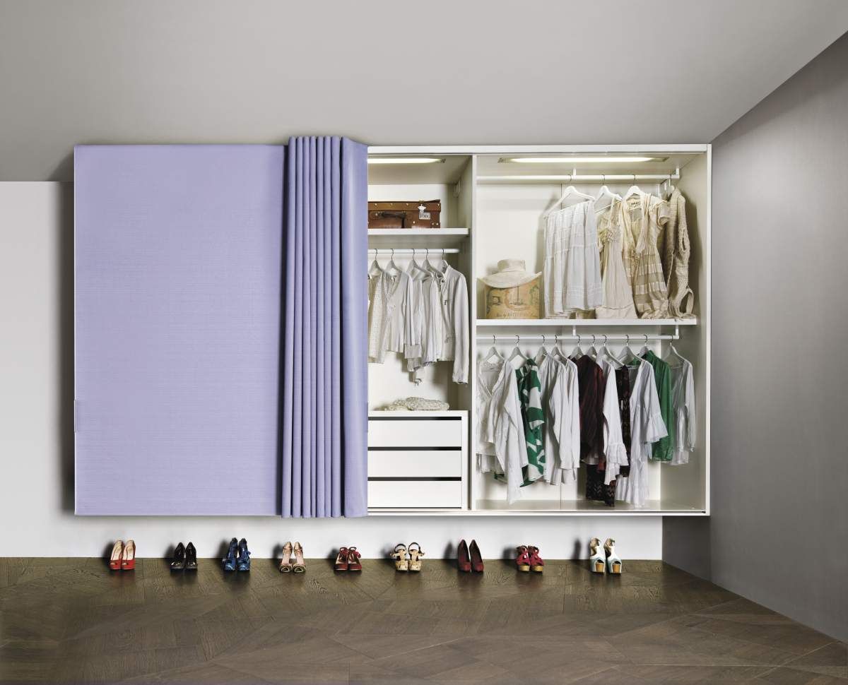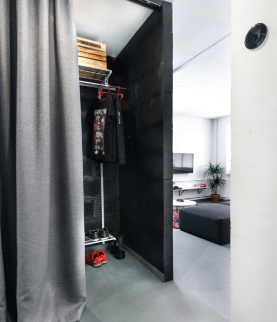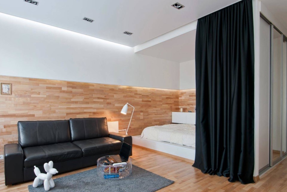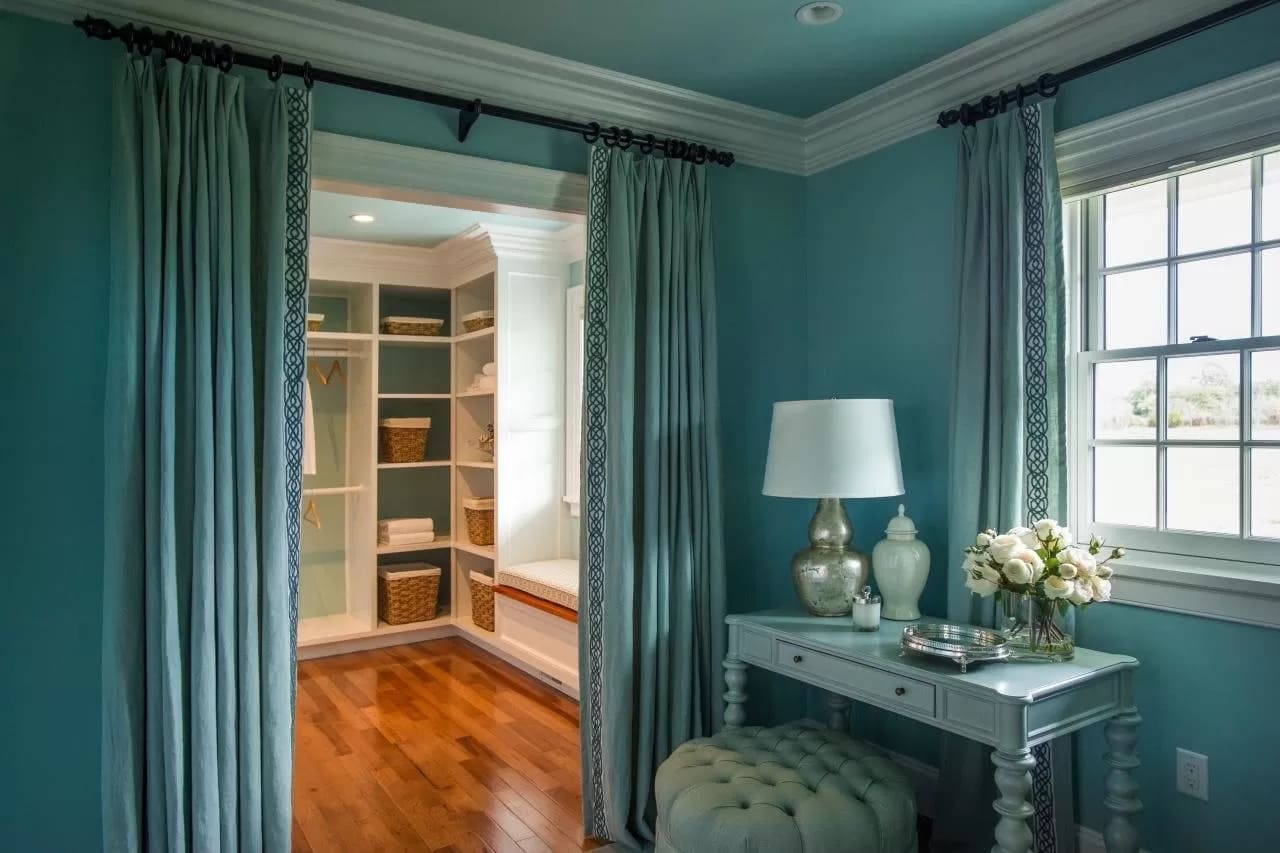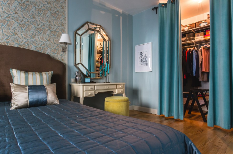 Нестандартное, но очень интересное решение предполагает замену двери на текстильное полотно. Такой креативный и весьма привлекательный дизайнерский ход заметно экономит пространство, абсолютно бесшумно и безопасно функционирует, что очень актуально для спален и детских комнат.