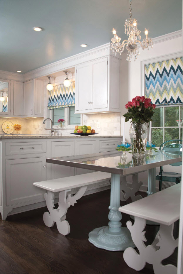 - если ткань штор будет с рисунком, то продублировать его можно в обивке стульев или табуретов (сиденья и спинки), оформлении обеденного стола (скатерть, дорожка, индивидуальные коврики или салфетки).
