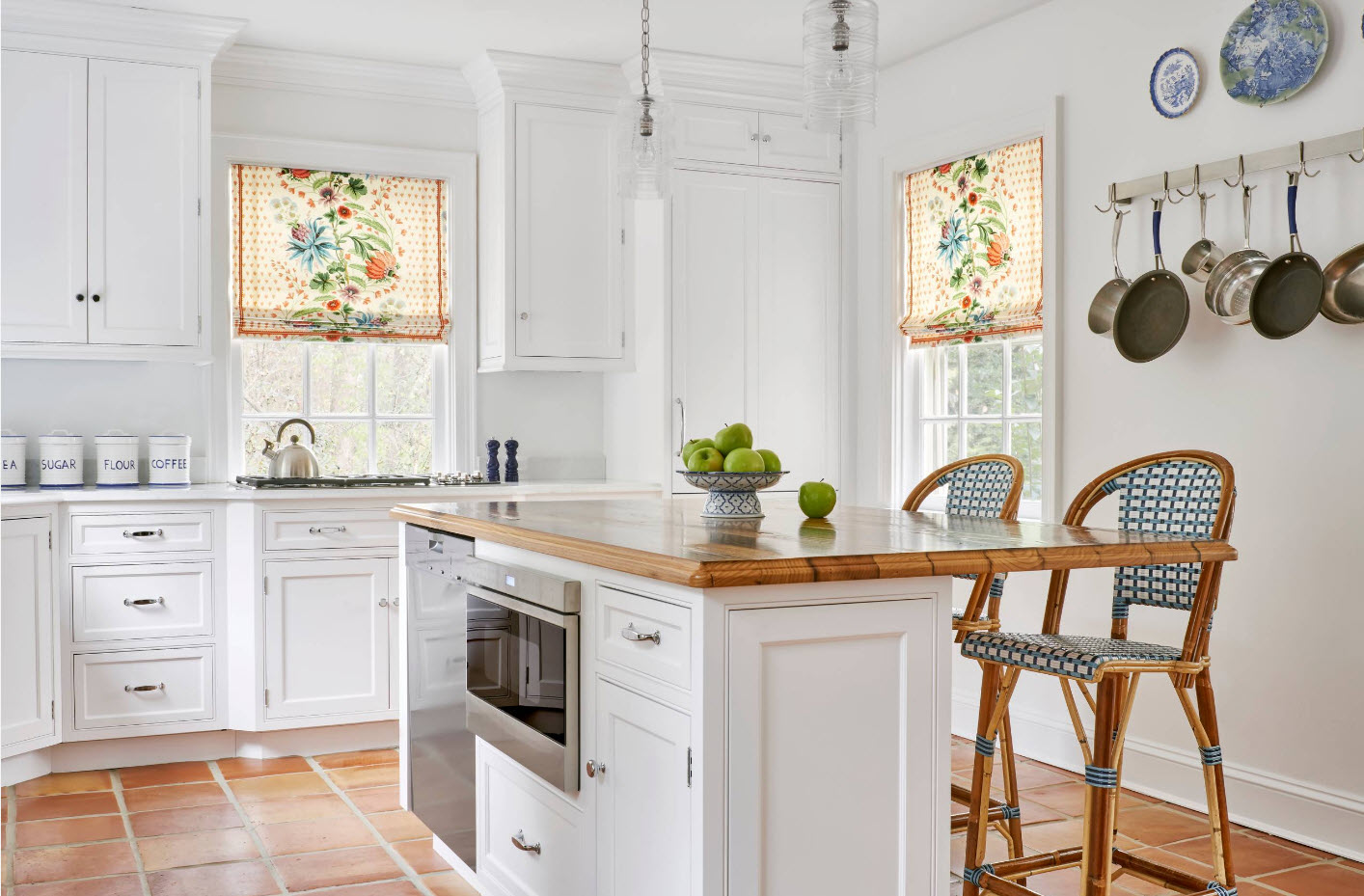 Принт на шторах можно использовать в качестве связующего элемента. Например, в кухонном интерьер, оформленном в нейтральных или светлых тонах, единственным ярким пятном выступает кухонный фартук, скатерть на обеденном столе или барные табуреты. Если в оконном текстиле используется тот же яркий цвет, то общая картина кухонного помещения становится гармоничнее.