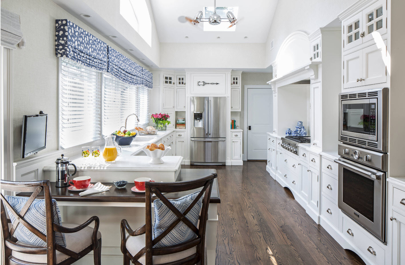 Если у вас просторная кухня с панорамным окном и красивым видом за ним, то логично использовать максимальное количество солнечного света, которое может проникнуть в помещение и не преграждать ему путь плотным текстилем. Тонкий полупрозрачный тюль будет отличным вариантом. Некоторые дизайнеры предлагают и вовсе оставить оконный проем без драпировки или ограничиться декоративным обрамлением.