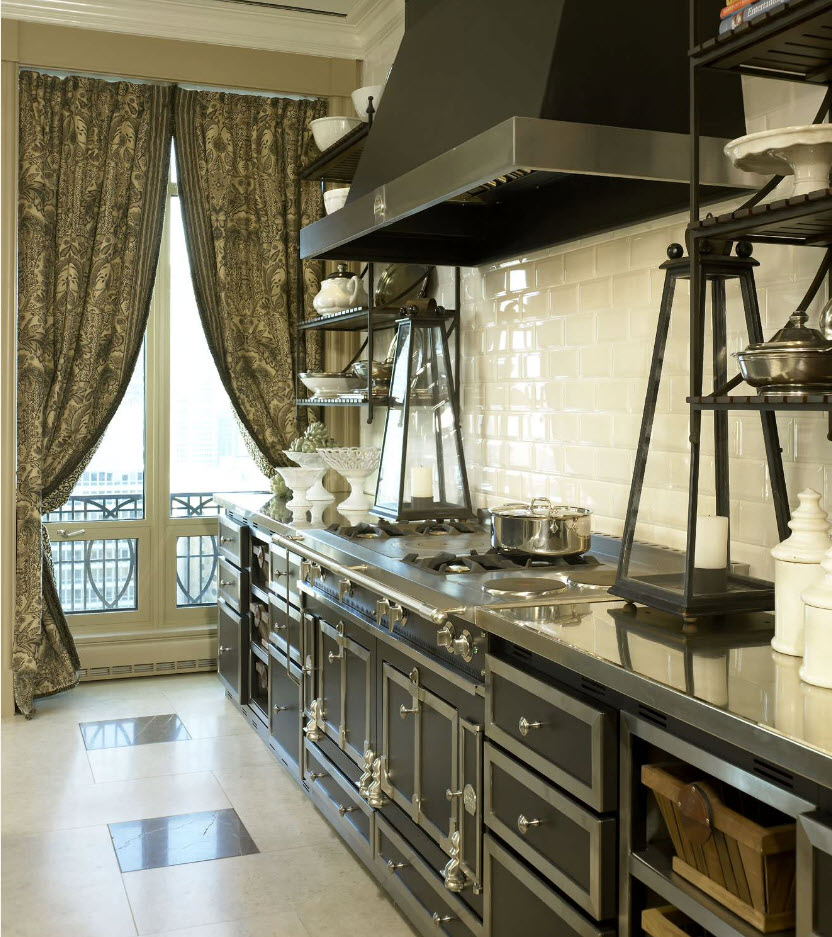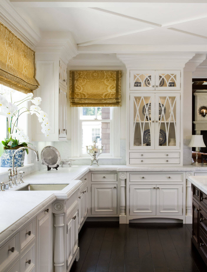 Гардины и шторы в кухонном пространстве могут использоваться не только для драпировки окон, но и в качестве занавеса для шкафов (встроенных или мобильных), кладовой, пространства под раковиной, за стеклянными вставками кухонных фасадов и многих других уголков кухни, которые хозяевам хотелось бы скрыть от глаз гостей, которые могут оказаться в помещении для приготовления пищи. Такие шторы и занавески могут быть исполнены в том же ключе, что и драпировка для окон, а могут и отличаться по типу ткани и цветовому решению – все зависит от того, каким предметам интерьера суждено быть акцентами.