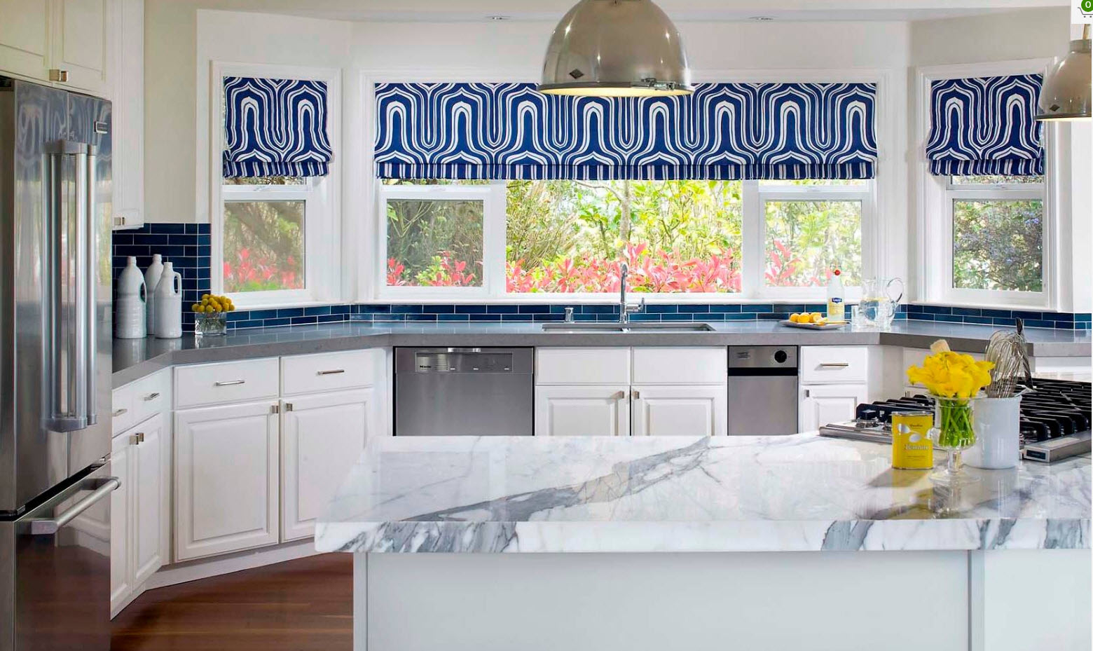 Популярны также геометрические и абстрактные принты. Все зависит от того, какого размера ваша кухня и в какой цветовой гамме она оформлена. В просторном помещении гораздо больше вариантов для маневра с крупным и ярким рисунком текстиля для окон. Но даже в небольшой кухне можно использовать ткань с орнаментом, рисунком, если отделка стен выполнена в светлом тоне и исполнение кухонных фасадов также не отличается яркостью.