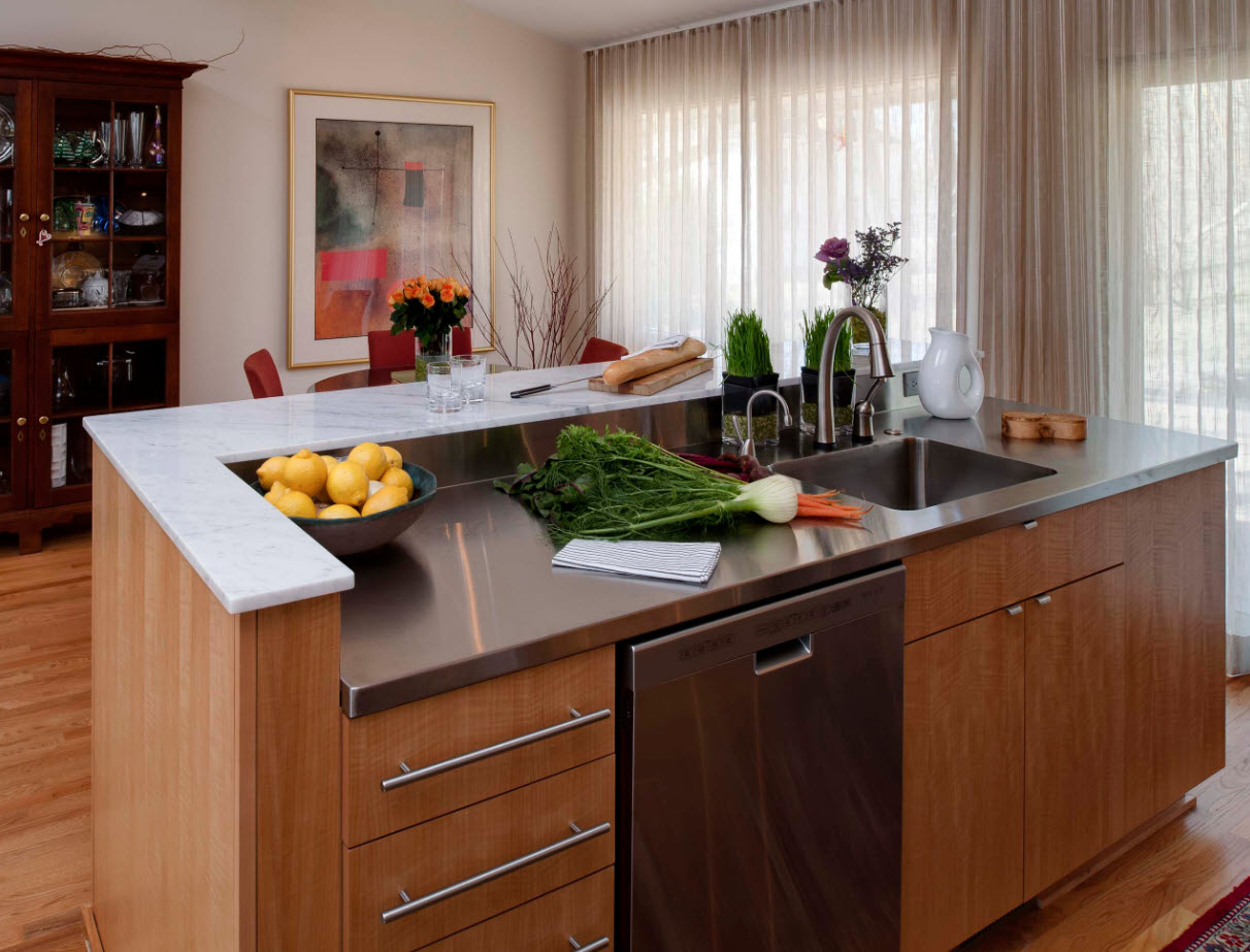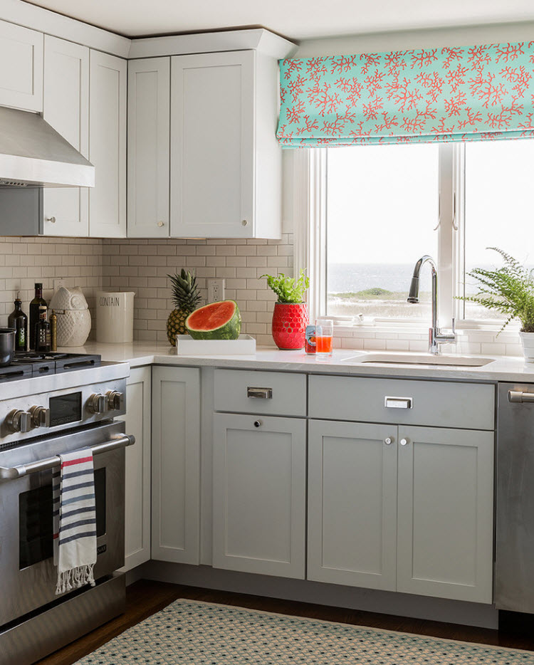 Или можно использовать тканевое оформление окон кухни в качестве акцентного элемента – единственного яркого пятна на светлом (или нейтральном) фоне. Ведь шторы гораздо проще заменить, чем мебель или отделку. Вы можете получить новый интерьер (по крайней мере – с другим настроением), заменив всего лишь один элемент дизайна.