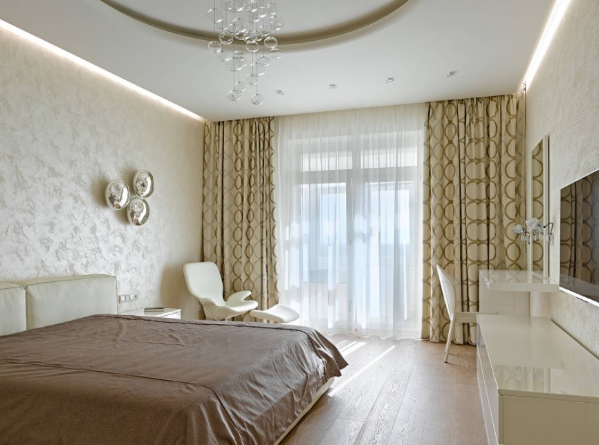 Несмотря на то, что в последнее время большей популярностью пользуются современные стили оформления интерьера с явным уклоном в сторону минимализма, дизайнеры не спешат сбрасывать со счетов любые классические идеи дизайна. Для спальни в стиле хай-тек актуально использование жалюзи либо прямых штор до пола с полным отсутствием даже незначительного намёка на декор. Идеальным дополнением минимализма считаются лёгкие шторы нейтральных расцветок. Оформление интерьера в стиле арт-деко не будет смотреться завершенным без штор из плотного материала в светлых тонах с золочёной отделкой. Для кантри приемлемо наличие на шторах из натуральных материалов рюш, оборок и лент. Спальня в скандинавском стиле не терпит вычурности. Прямые шторы в спокойных тонах в этом случае станут наиболее правильным решением.
