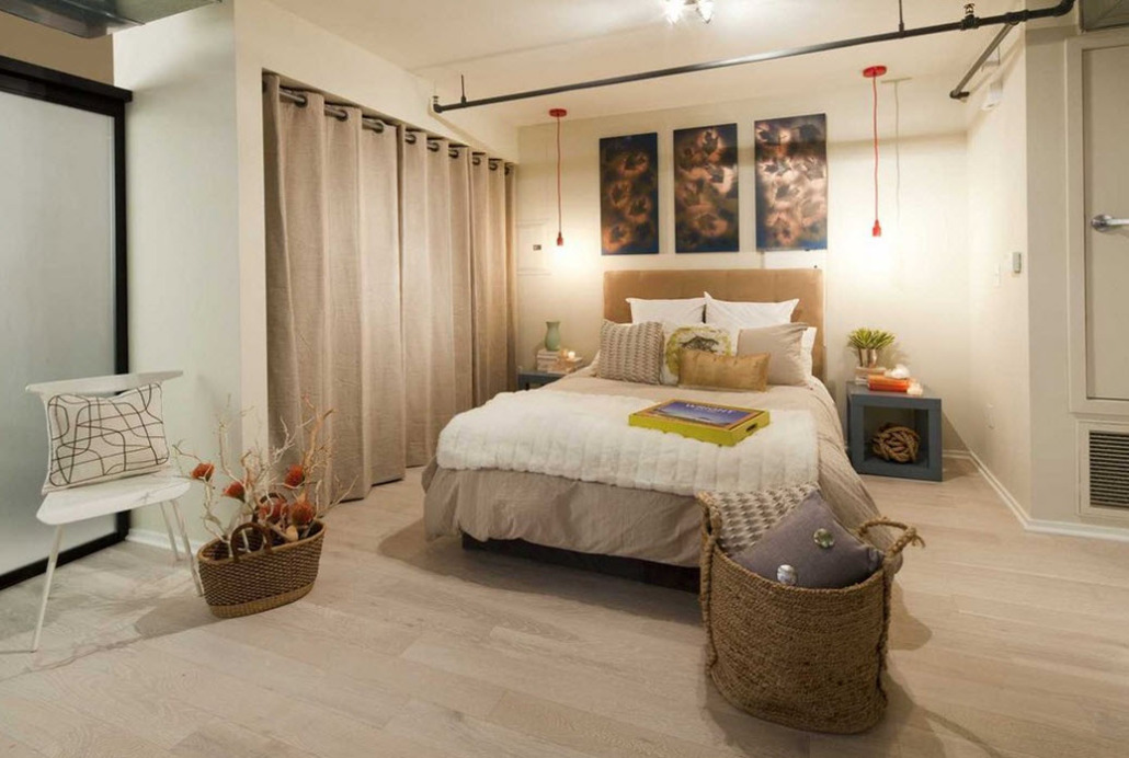 Говоря о функциональности, нельзя не сказать, что при помощи шторы на люверсах легко разделить комнату на зоны. Это именно тот вариант организации пространства, когда неуместны стационарные перегородки. Ведь при необходимости разделенную на зоны комнату легко можно сделать большой и просторной.