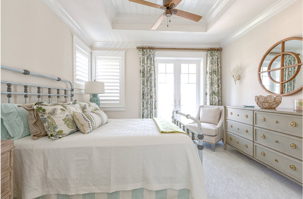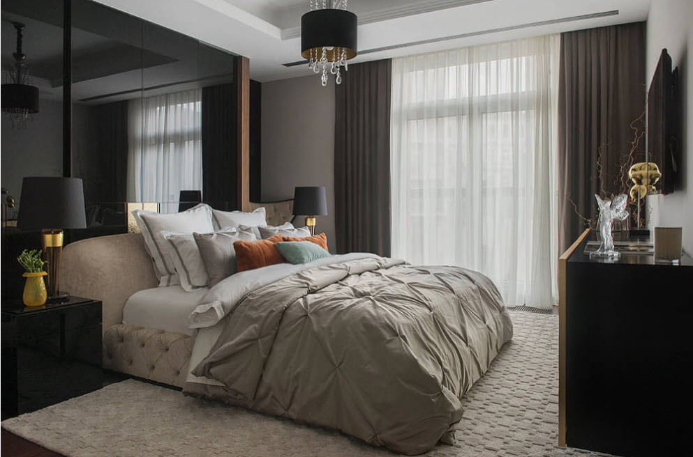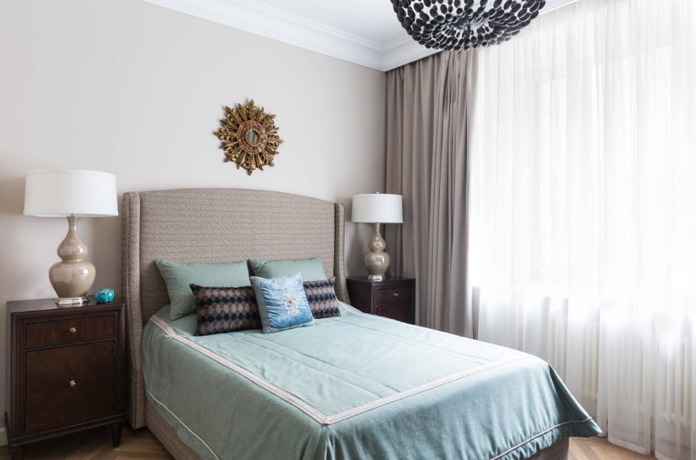 И все же, россиянам ближе по духу традиционный вариант оформления окон в спальне – плотные шторы в сочетании с полупрозрачным тюлем (вуалью). Тонкие занавески позволяют слегка приглушить солнечный свет, рассеять его, создав определенную атмосферу в помещении, а шторы из плотной ткани послужат препятствием в случае необходимости – перед сном вечером или в дневное время защититься от солнечных лучей.