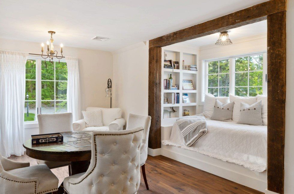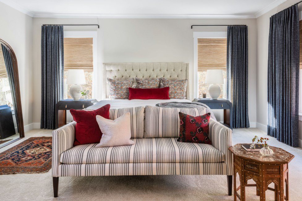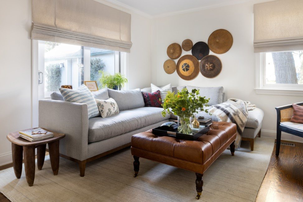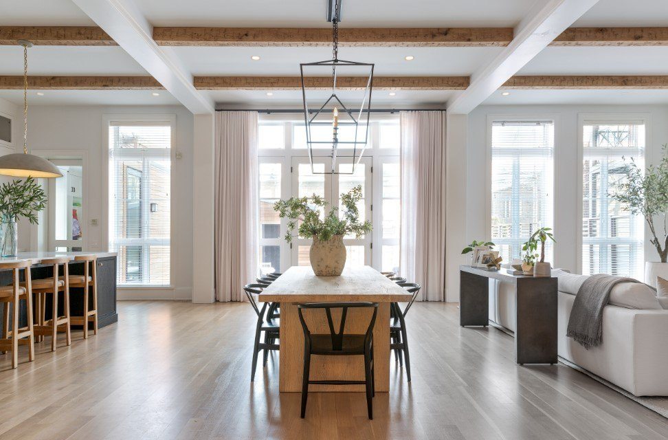 Стиль относится к простым и универсальным дизайнам, поэтому окна в данном случае можно оставлять и вовсе без штор. Но если подобная открытость не вариант, тогда подойдут однотонные материалы в нейтральной палитре с минимальным количеством декора. При желании выбрать текстиль с узором, следует отдавать предпочтение крупным орнаментам.