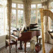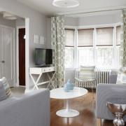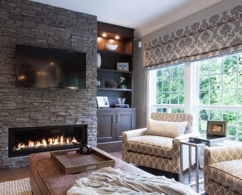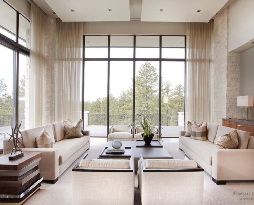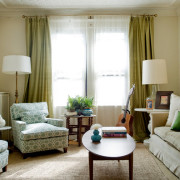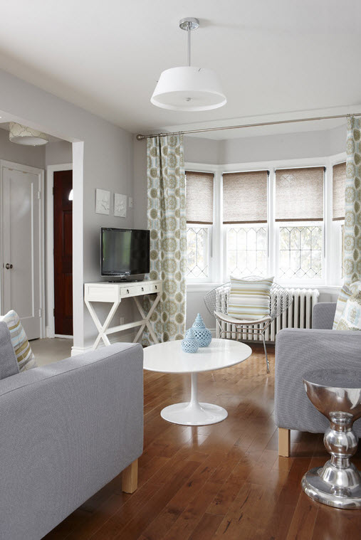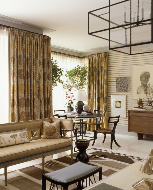 В гостиной комнате ни когда не используются стационарные (не сдвигающиеся в сторону или вверх) шторы из плотной ткани. Для создания уютной обстановки необходимо естественное освещение, поэтому плотная ткань используется в умеренном количестве и всегда должна сохраняться возможность распахнуть шторы, впустив в гостиную свежий солнечный свет.