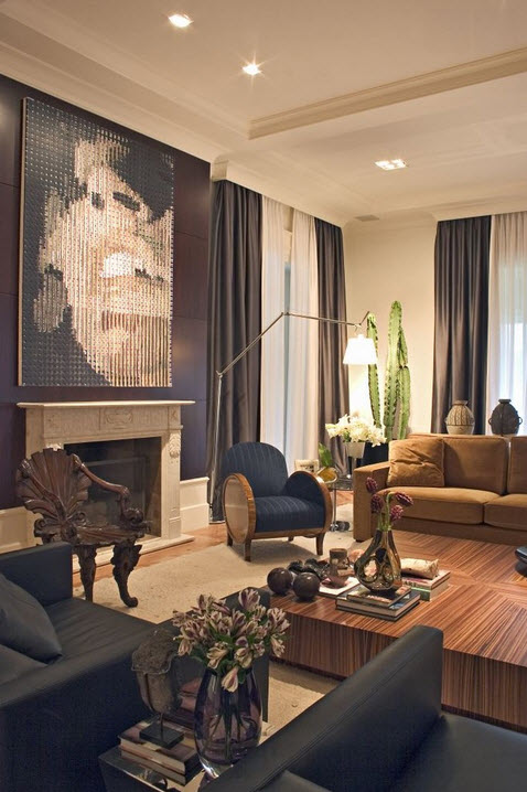 Одна из основных задач при оформлении гостиной – создание уютной и благодушной атмосферы для отдыха. Дизайнеры выделяют ряд приемов, благодаря которым любой из стилей интерьера, даже отдаленный от представлений о домашнем комфорте и устроенности, приобретает особую гармоничность. Коренным образом изменить вектор стиля можно за счет материалов, используемых в декоративной отделке и дополнительных акцентах. Природные фактурные породы дерева, натурального камня и текстиль всегда наполняют интерьер гостиной тематической семейной атмосферой. Однако некоторые из стилей интерьера по определению не могут оформляться с помощью фактурных материалов, так как это нарушает основной сюжет и цветовую гамму.