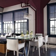 Очень большие панорамные окна дополняются французскими, австрийскими, римскими шторами или же вертикальными жалюзи. Витражные окна дополняются любым из видов штор, выполненных из прозрачных легких тканей. Арочные оконные проемы требуют сохранения симметрии верхней части, поэтому карниз должен крепиться к потолку, а шторы иметь обтекающую арочную форму без лишних горизонтальных линий.