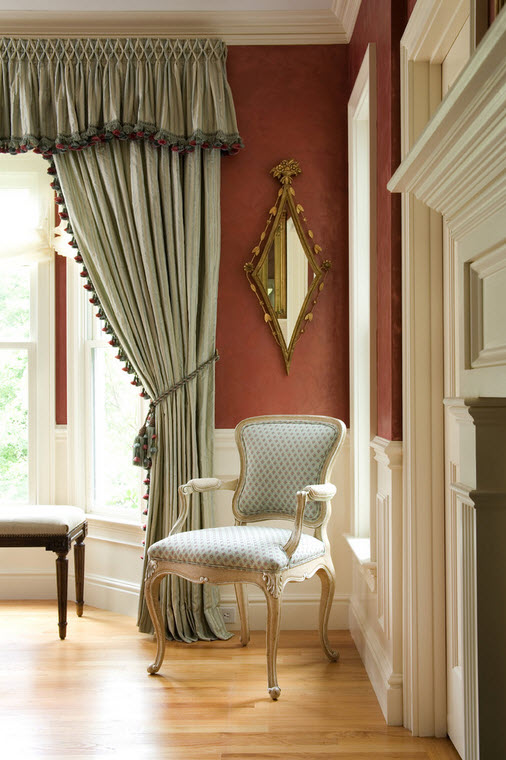 Барокко использует самые смелые сочетания темных оттенков красного и золотого с дополнительными декоративными кистями, лентами, подхваты. Заявка на роскошь требует использовать глянцевые, тяжелые ткани в классических и французских драпировках.