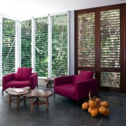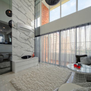 Не редко японские шторы используются в виде перегородок. Тонкое тканевое полотно, отделяющее одно пространство от другого занимает значительно меньше места, нежели стена или мебель, исполняющая роль перегородки, а полупрозрачная текстура позволяет свету проникать даже в удаленный от естественного источника света угол помещения.