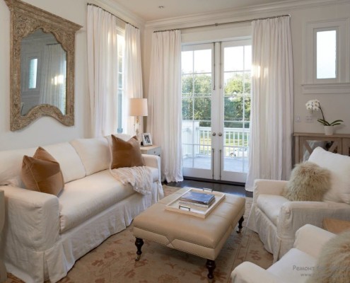 - интерьеры, предполагающие использование текстиля как основного цветового элемента подчеркиваются с помощью использования одной ткани (цвета и рисунка) для штор и мелких деталей: подушки, обивка и т.д;