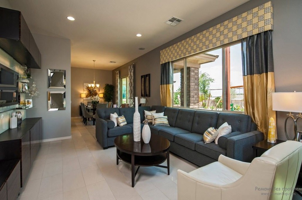 Цвет имеет значительное влияние на размер помещения гостиной. Основное правило создания иллюзий, учитывая зависимости цвета и объема: темные цвета уменьшают, светлые увеличивают.