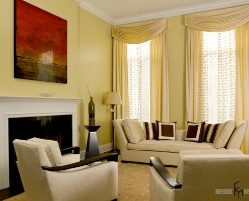 Значительную часть тепла и уюта вносят шторы при оформлении декора окон зала. Одновременно с этим они придают залу строгость и торжественность.