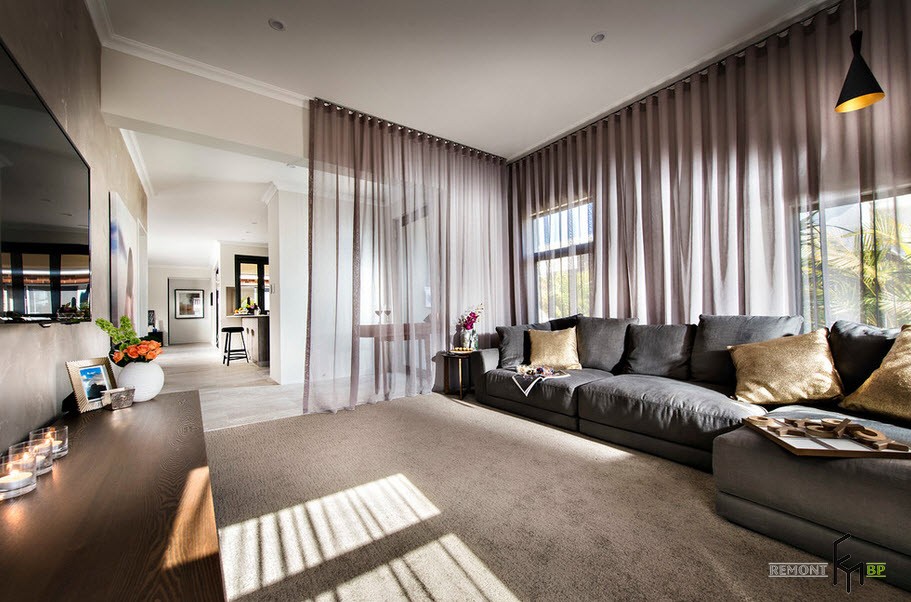 Если разделить комнаты квартиры на классы, то зал, бесспорно, относится к представительскому классу. Его дизайн должен сразу рассказать гостю о хозяине квартиры: его достатке, приверженности к определенному жизненному укладу, осведомленности о современных модных тенденциях в дизайне и прочее. Шторы в зале должны в полной мере соответствовать этой комнате.